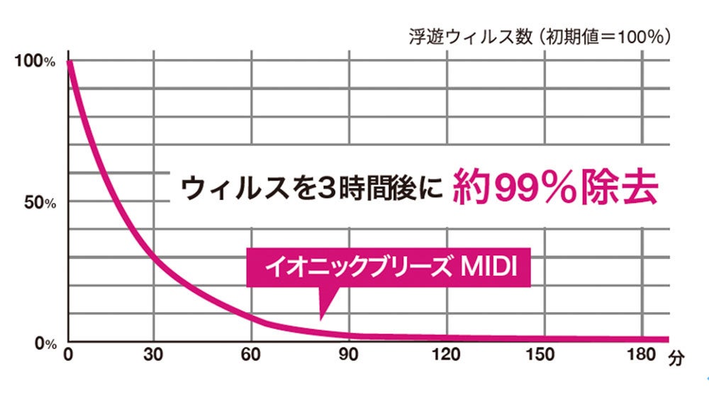ウィルス除去の実験で25 ㎡(約6 畳)の空気中のウィルスを180 分で99.52%除去したことが確認され、ウィルスの除去が期待できます。※(財) 北里環境科学センター調べ