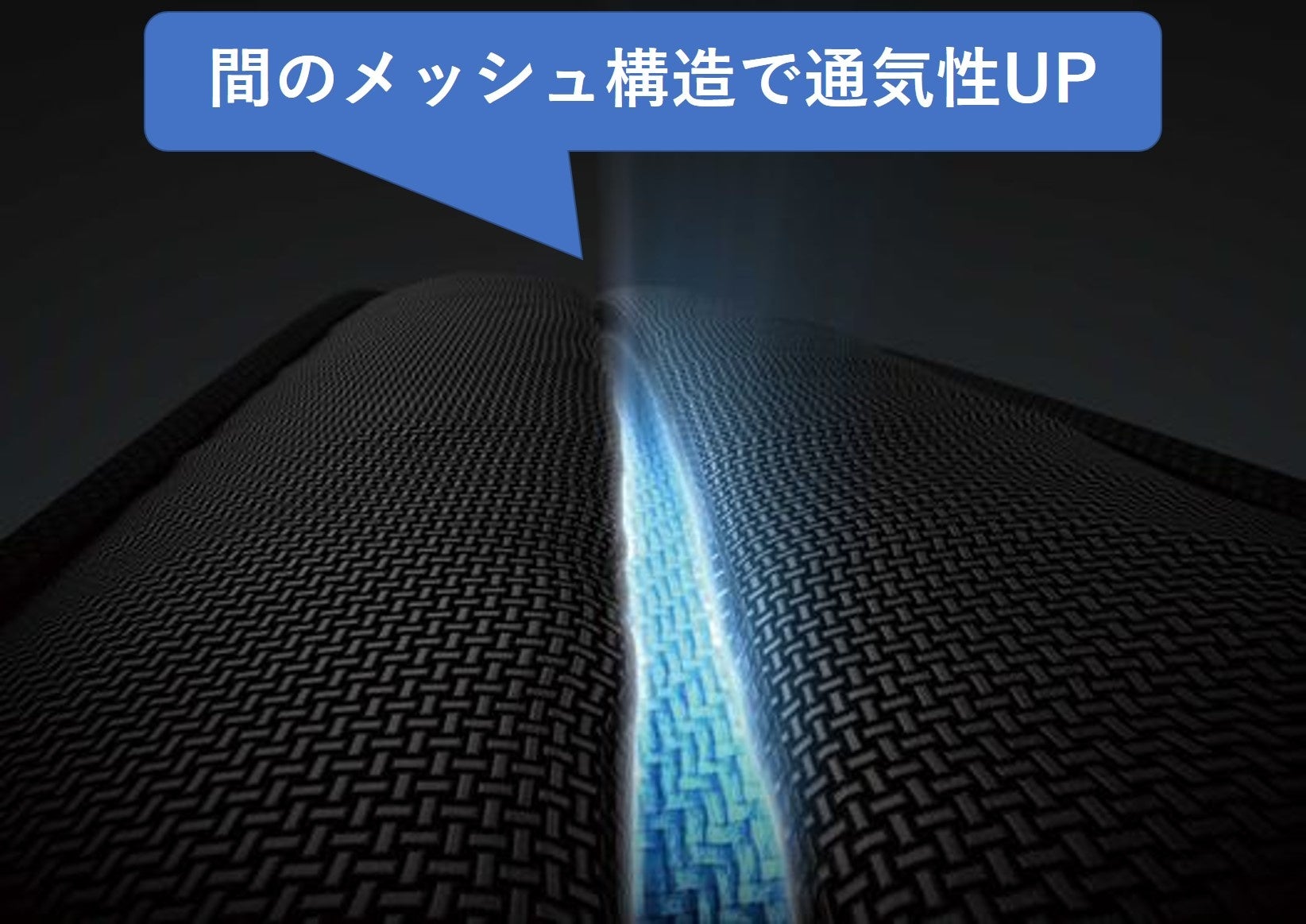 ショルダーベルトの分割設計で荷重を分散。肩にフィットしやすい角度設計と連動し、軽量感を生み出すことで、身体への負担を軽減します。(※ミズノ従来品比)