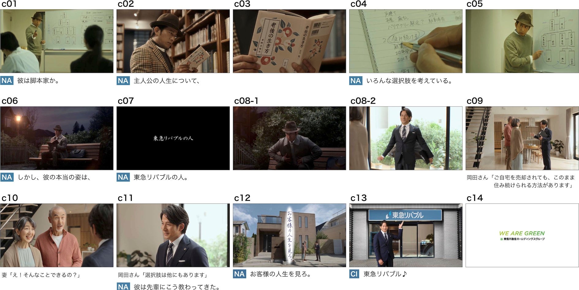 新CMでは、お客様をドラマの主人公に見立て、幾通りもの筋書きを考案する「脚本家」に岡田さんが扮し、不動産のプロとしてお客様の期待に応えるために日々奮闘する東急リバブルの営業パーソンの姿と重ね合わせながら熱く演じています。