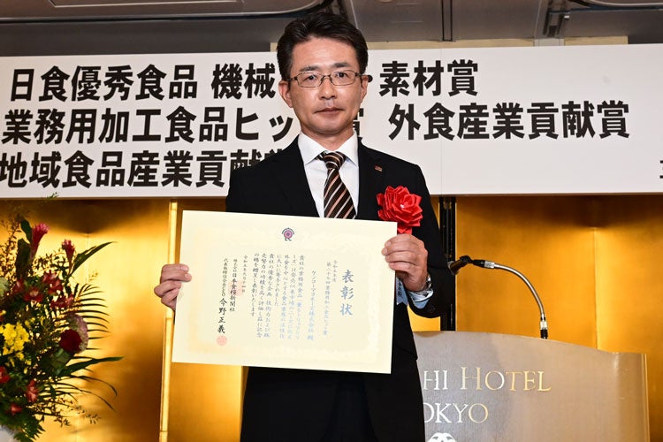 今年は業務用加工食品ヒット大賞を1社、業務用加工食品ヒット賞を12社が受賞し、贈呈式では受賞各社へ株式会社 日本食糧新聞社 代表取締役会長CEOの今野 正義氏から表彰状が授与されました。