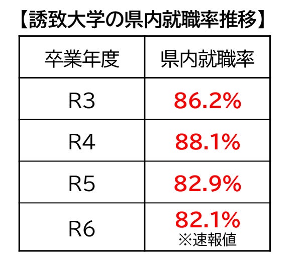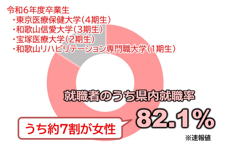 令和6年度の誘致大学卒業生のうち就職者は257人で、そのうち県内就職率は82.1%(211人※速報値)にのぼり、令和3年度に初めて卒業生を輩出してから4年連続80%以上となりました。また、そのうち約7割が女性で、特に看護系では女性が9割を占めるなど、県内でエッセンシャルワーカーとして定着しています。