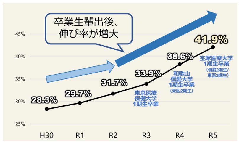 和歌山大学、和歌山県立医科大学も含めた市内大学全体の県内就職率については、平成30年度は28.3%でしたが、大学誘致の取組により年々増加し、令和5年度は41.9%(就職者1,101人中461人)となり、約14%増加しました。