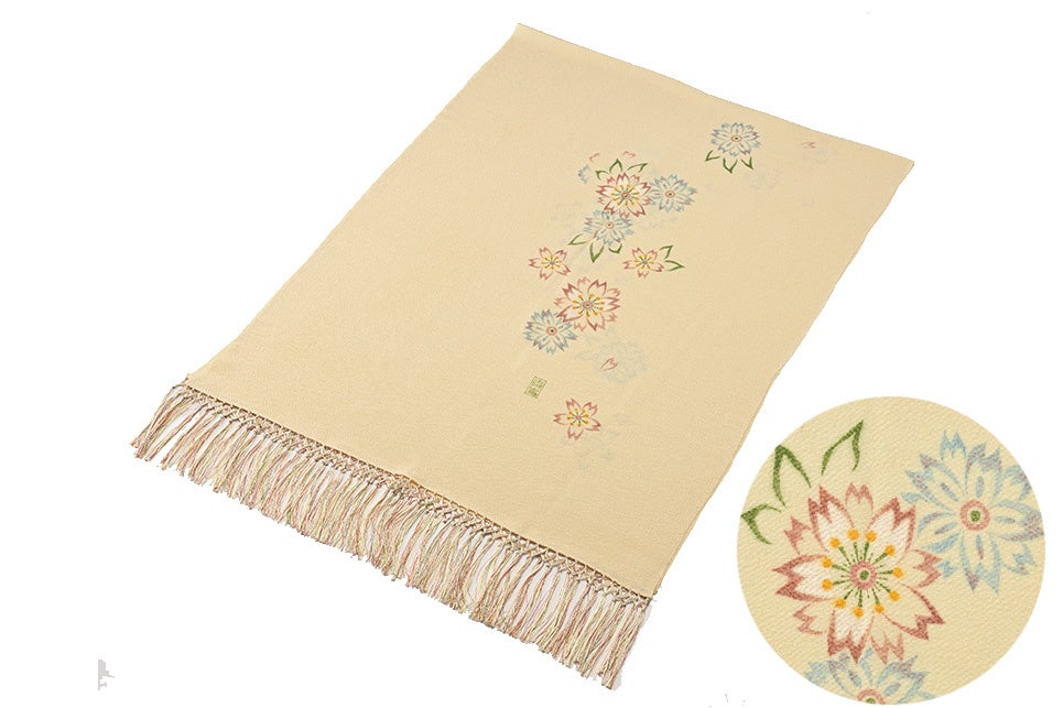 石川県金沢市に和装小物商品を取り扱い<寺嶋和装>。1点1点手染めで創作した生地や様々な素材を使用したショール・バッグなどを取り扱っています。本商品は和装・洋装、どちらでも華やかに装いを演出する195×68cmサイズの大判ショール。