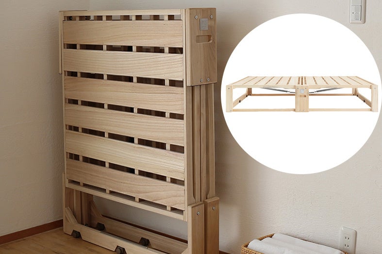 防虫性、耐火性、軽さ、柔らかさ。そんな桐の優位性に、アイデアを加えて長く愛用いただける生活具をつくる桐建材。片手でラクラク折りたためる軽さ・お部屋を広く使える・そのまま布団も干せる圧倒的な使い勝手と使い心地を追求した折り畳みベッド。