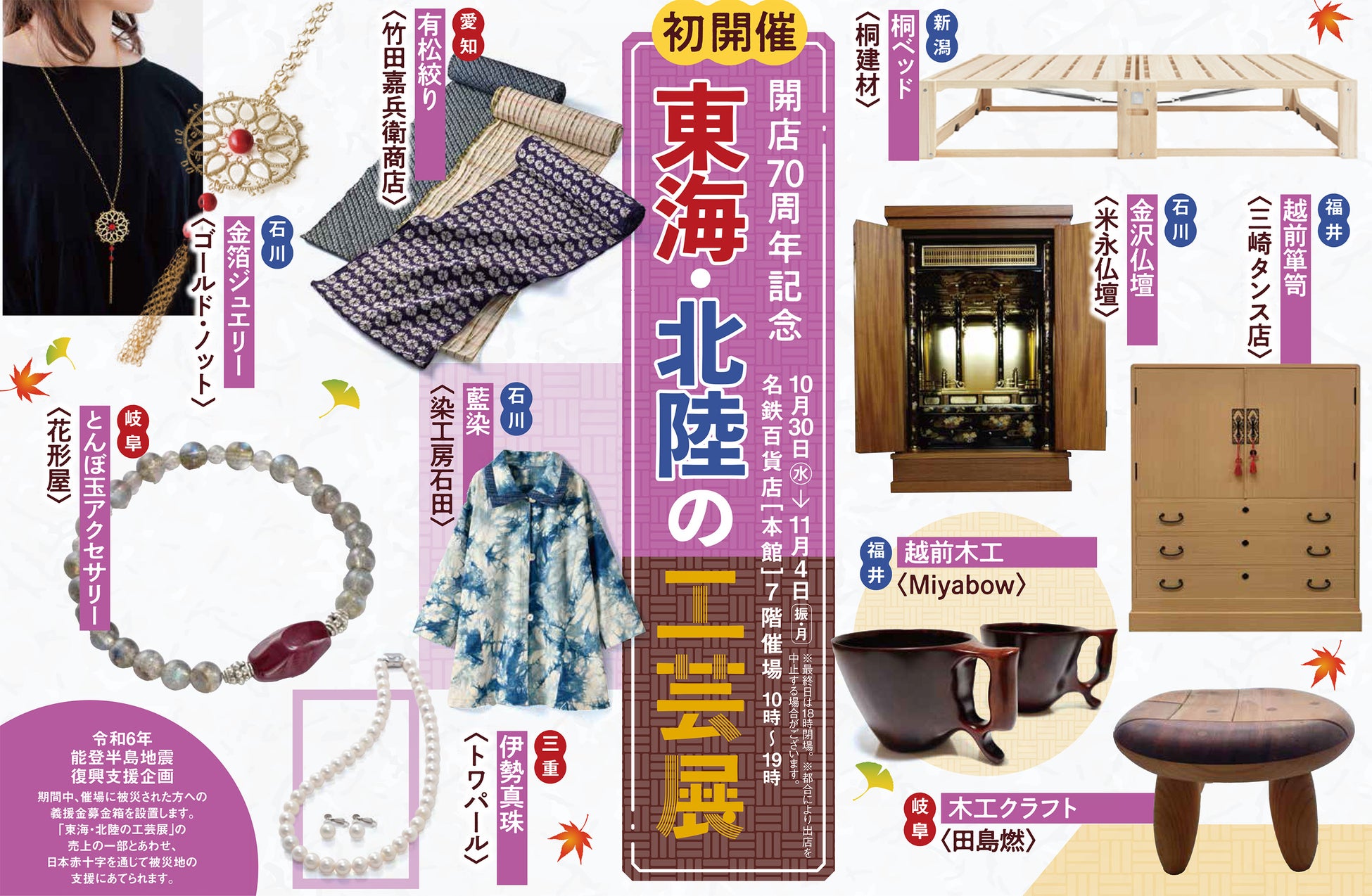 今年の12月1日に開店70周年を迎える名鉄百貨店。周年のテーマは地域社会との絆を深めることを掲げており、「ものづくり」の中心でもある私たちの地元中部エリアをクローズアップし、今もなお脈々と受け継がれている職人技の数々を再認識していただく場として、「東海・北陸の工芸展」を初開催します。売上の一部を震災の影響の大きかった北陸の工芸支援のために寄付することで、工芸をはじめとした地域の復興に役立てて頂きたいと考えています。
