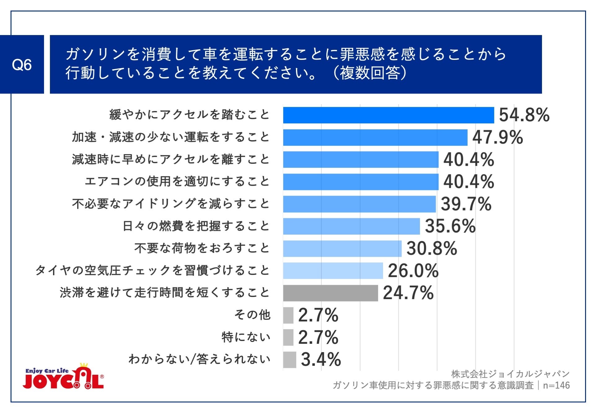 Q1で「非常に感じる」「やや感じる」と回答した方に、「Q6.ガソリンを消費して車を運転することに罪悪感を感じることから行動していることを教えてください。(複数回答)」(n=146)と質問したところ、「緩やかにアクセルを踏むこと」が54.8%、「加速・減速の少ない運転をすること」が47.9%、「減速時に早めにアクセルを離すこと」が40.4%という回答となりました。