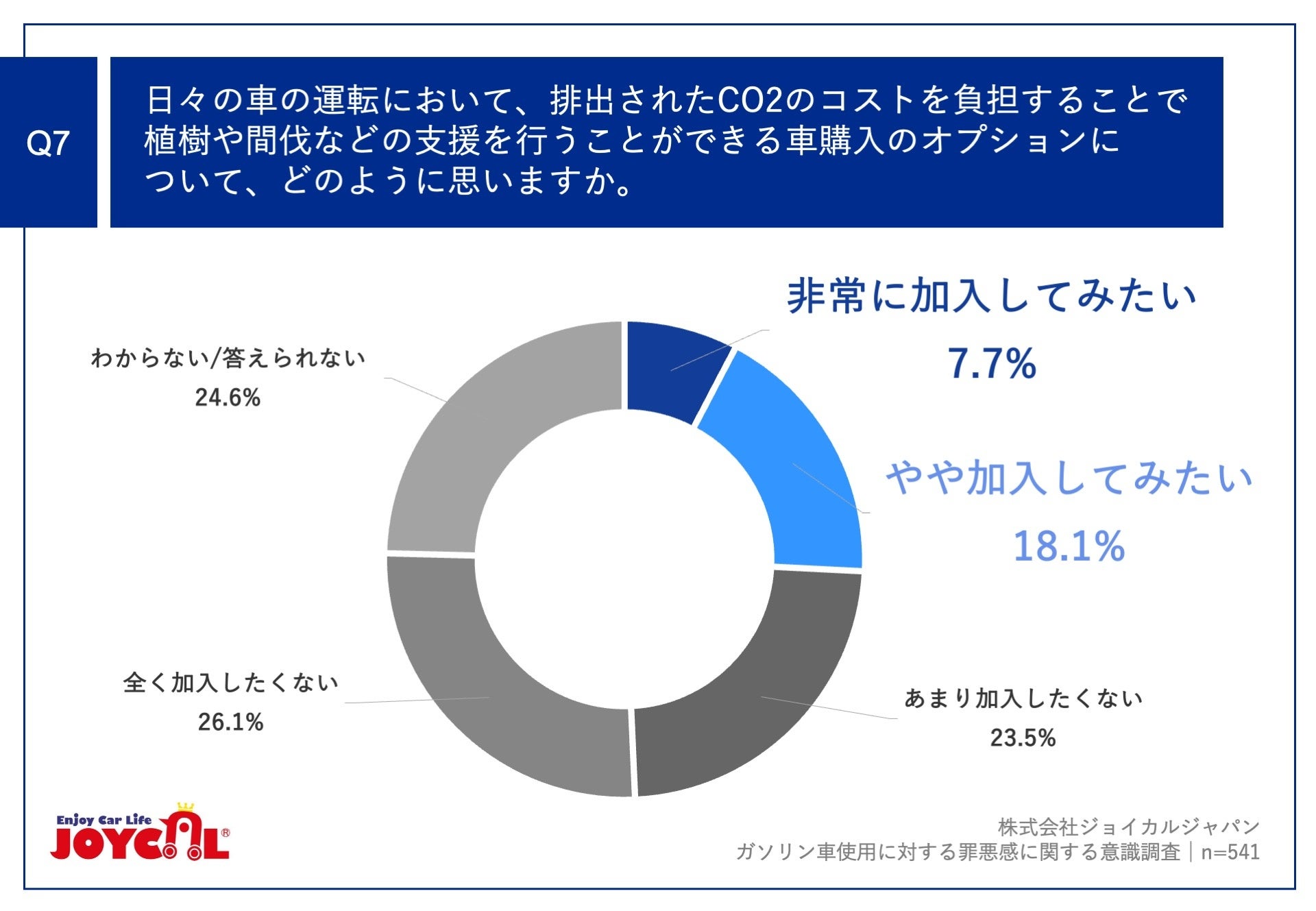 「Q7.日々の車の運転において、排出されたCO2のコストを負担することで植樹や間伐などの支援を行うことができる車購入のオプションについて、どのように思いますか。」(n=541)と質問したところ、「非常に加入してみたい」が7.7%、「やや加入してみたい」が18.1%という回答となりました。