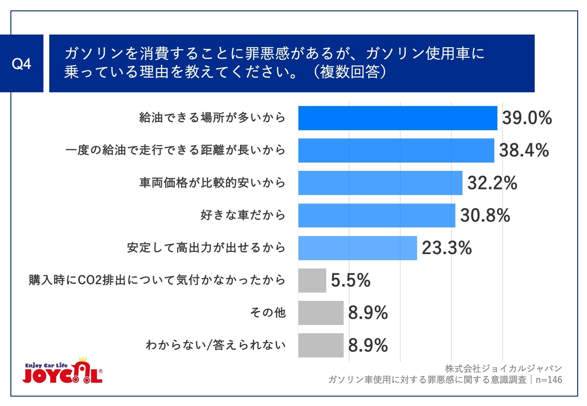Q1で「非常に感じる」「やや感じる」と回答した方に、「Q4.ガソリンを消費することに罪悪感があるが、ガソリン使用車に乗っている理由を教えてください。(複数回答)」(n=146)と質問したところ、「給油できる場所が多いから」が39.0%、「一度の給油で走行できる距離が長いから」が38.4%、「車両価格が比較的安いから」が32.2%という回答となりました。