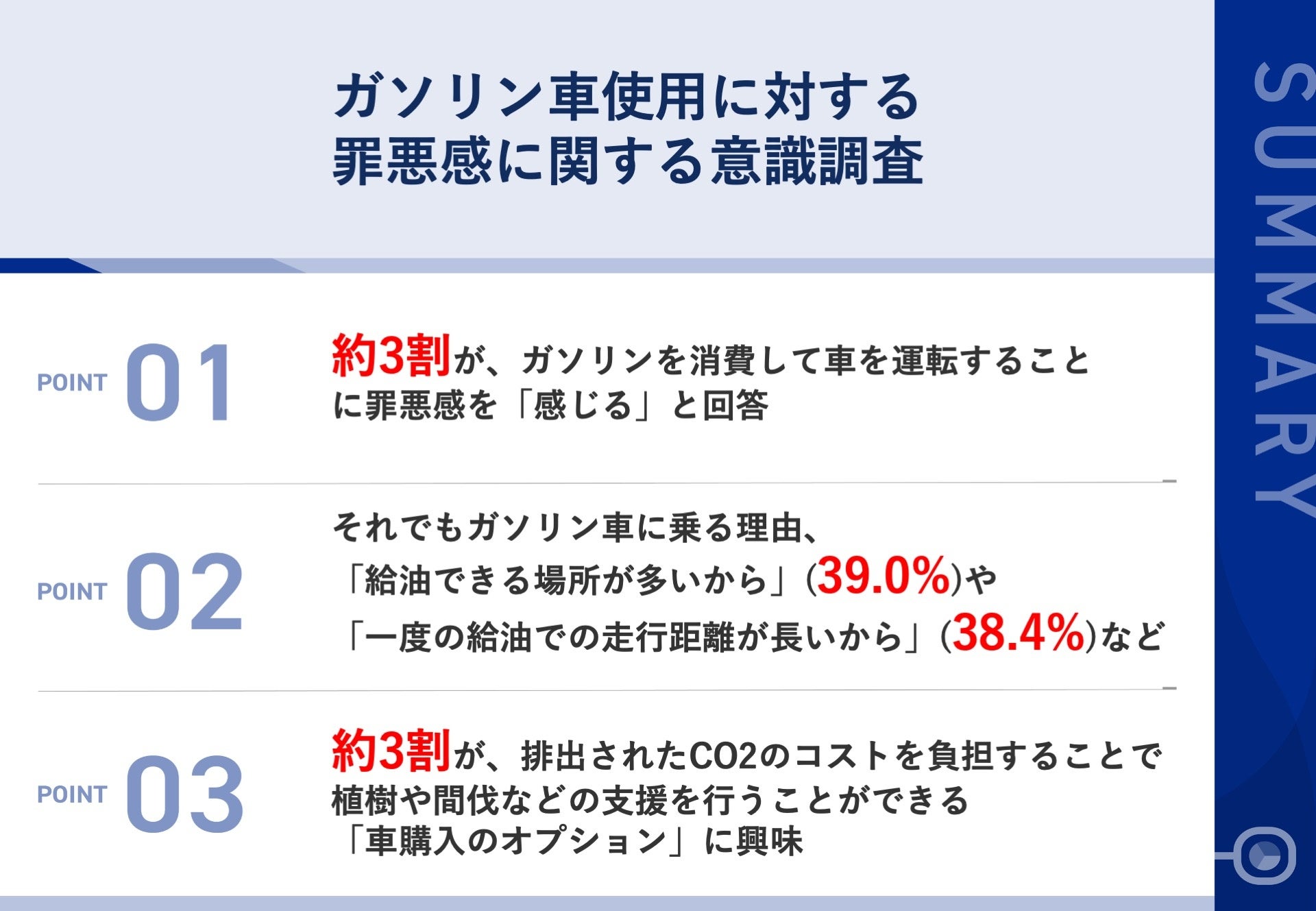 まず、約3割がガソリンを消費して車を運転することに罪悪感を感じており、その理由としては、「地球温暖化が促進されるから」(62.3%)や「排気ガスが大気を汚染するから」(57.5%)が上位を占めました。また、ガソリン使用車に乗り続ける理由としては、「給油できる場所が多いから」(39.0%)や「一度の給油で走行できる距離が長いから」(38.4%)などが挙げられています。さらに、ガソリンを消費することに罪悪感を感じることから行動していることとして、「緩やかにアクセルを踏むこと」(54.8%)や「加速・減速の少ない運転をすること」(47.9%)を意識しています。最後に、約3割は、排出されたCO2のコストを負担することで植樹や間伐などの支援を行う車購入のオプションに興味持っており、「SDGsに貢献できるから」(58.6%)や「地球の自然環境を守りたいから」(53.6%)などが理由として挙がりました。