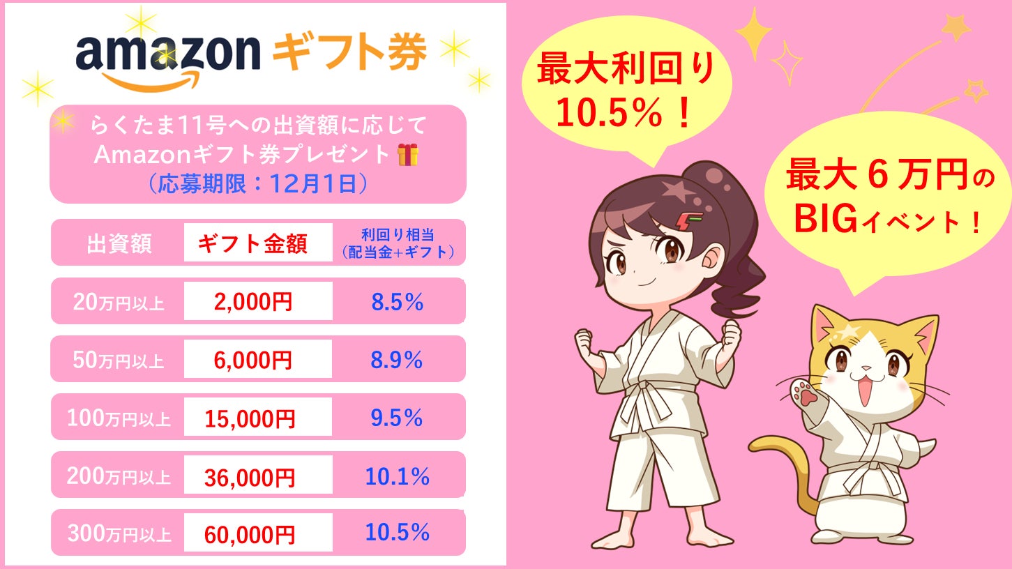 【らくたま】最高利回り10.5%!のBIGキャンペーンを実施中。らくたま11号出資でAmazonギフト券最大6万円分プレゼント(12月1日迄の限定キャンペーン)