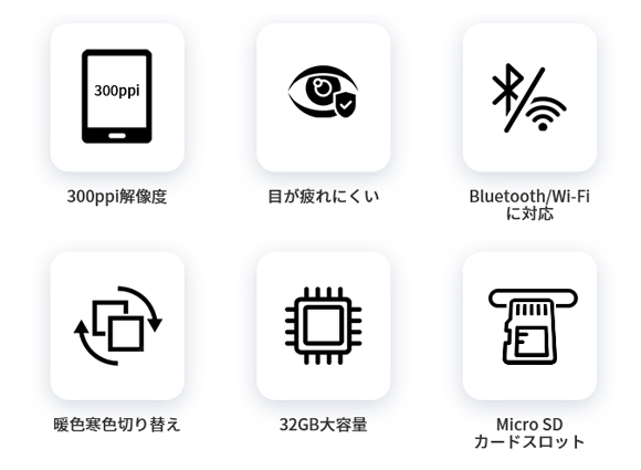 ①E Ink電子ペーパーを採用し、長時間の読書でも疲れにくいです。