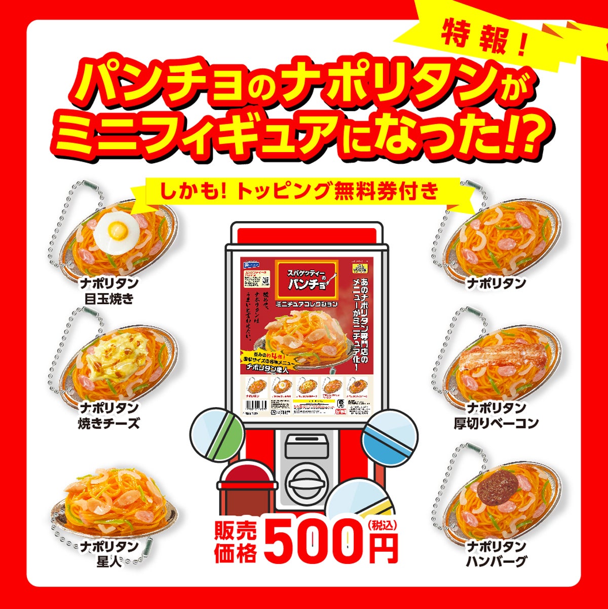 ナポリタンをはじめ人気のトッピング4種(目玉焼き・厚切りベーコン・焼きチーズ・ハンバーグ)と名物超大盛りナポリタン星人の全6種類が、楽しいミニフィギュアになりました。しかも全国のパンチョで使えるトッピング無料券の特典付きです。