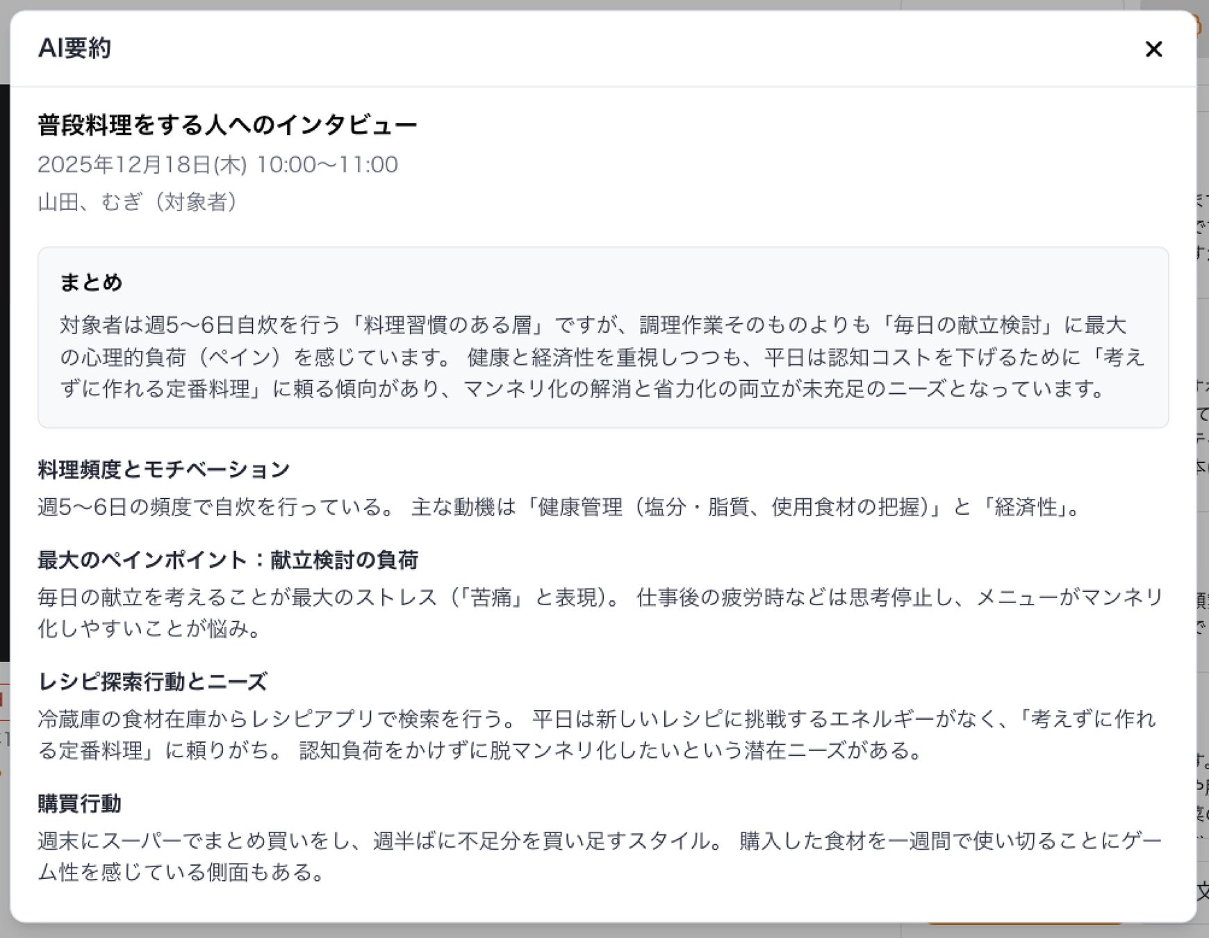 会話内容の全文テキスト化だけでなく、AIによる要約(サマリ)の生成まで自動で行われます。インタビュー後の振り返りや分析業務の効率化を支援します。