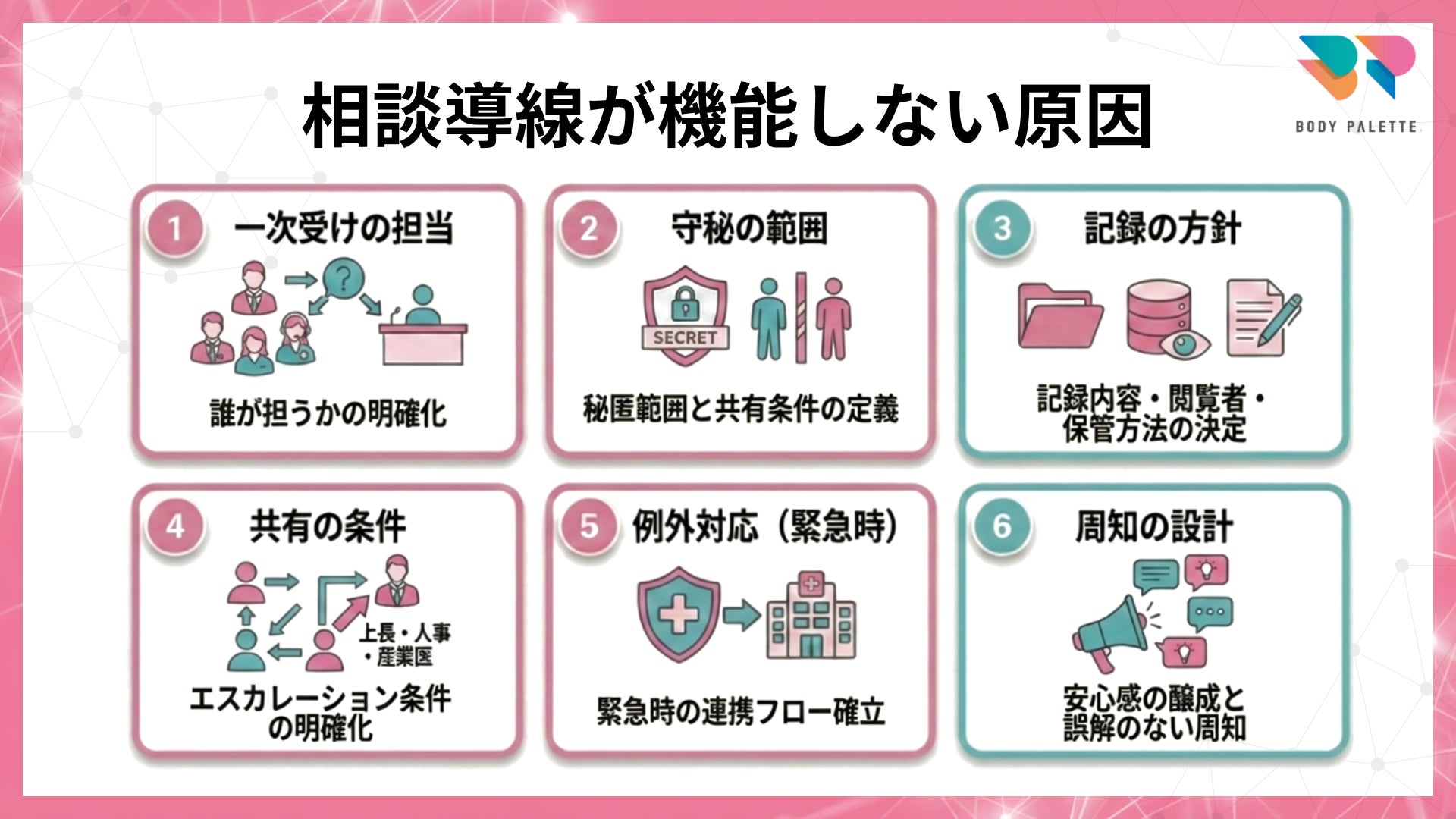 相談導線を作る際に止まりやすいのは、導線の「見た目」ではなく、運用の前提が揃っていないことです。特に以下の論点が未整理なままだと、相談は起きにくくなります。