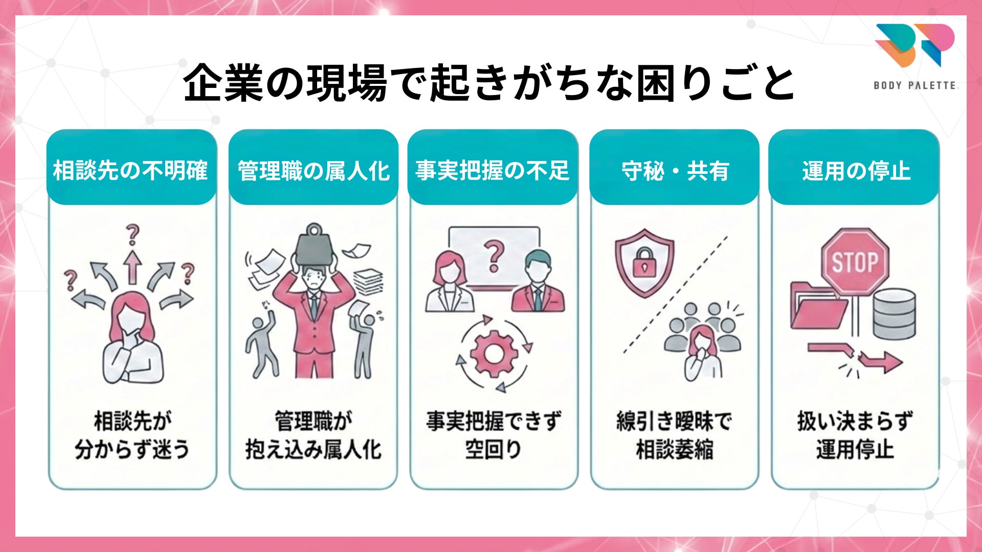相談導線についても、窓口を作って終わらせず、守秘・共有・記録の前提を揃え、現場で回る運用に落とし込む設計支援を重視しています。