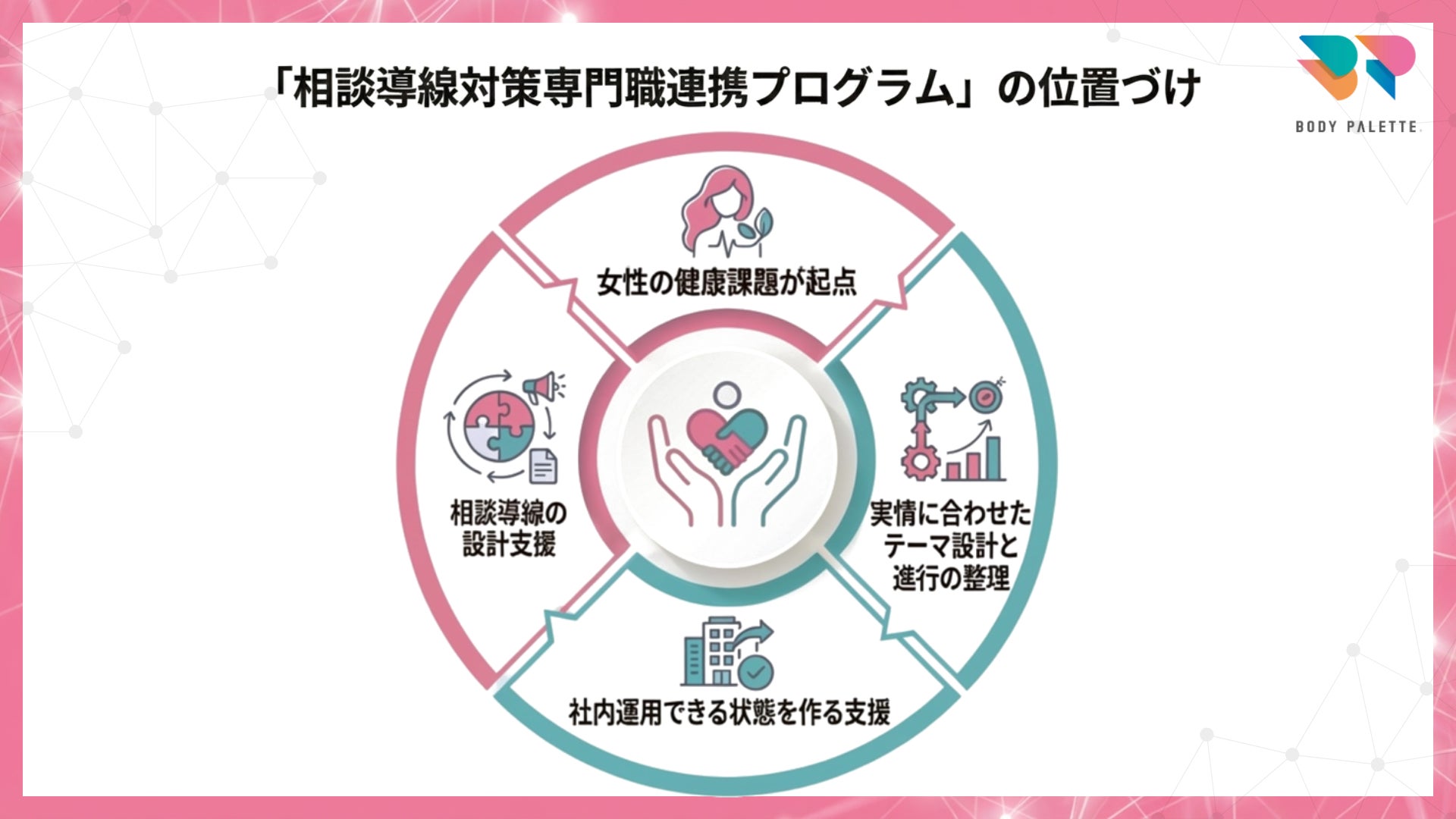 本プログラムは、女性の健康課題を起点に、企業の実情に合わせてテーマ設計と進め方を整理し、社内で運用できる状態を作るための支援です。