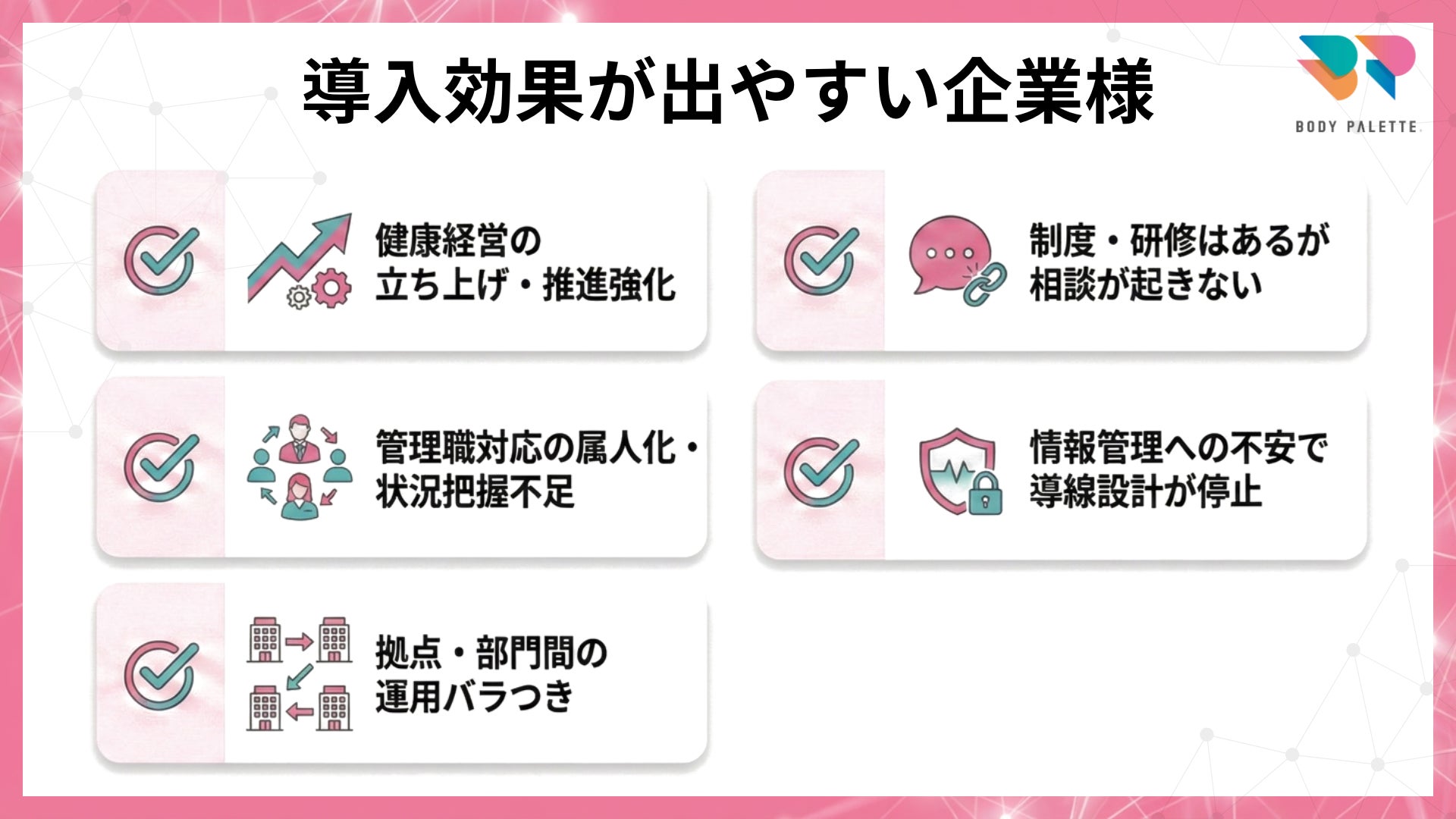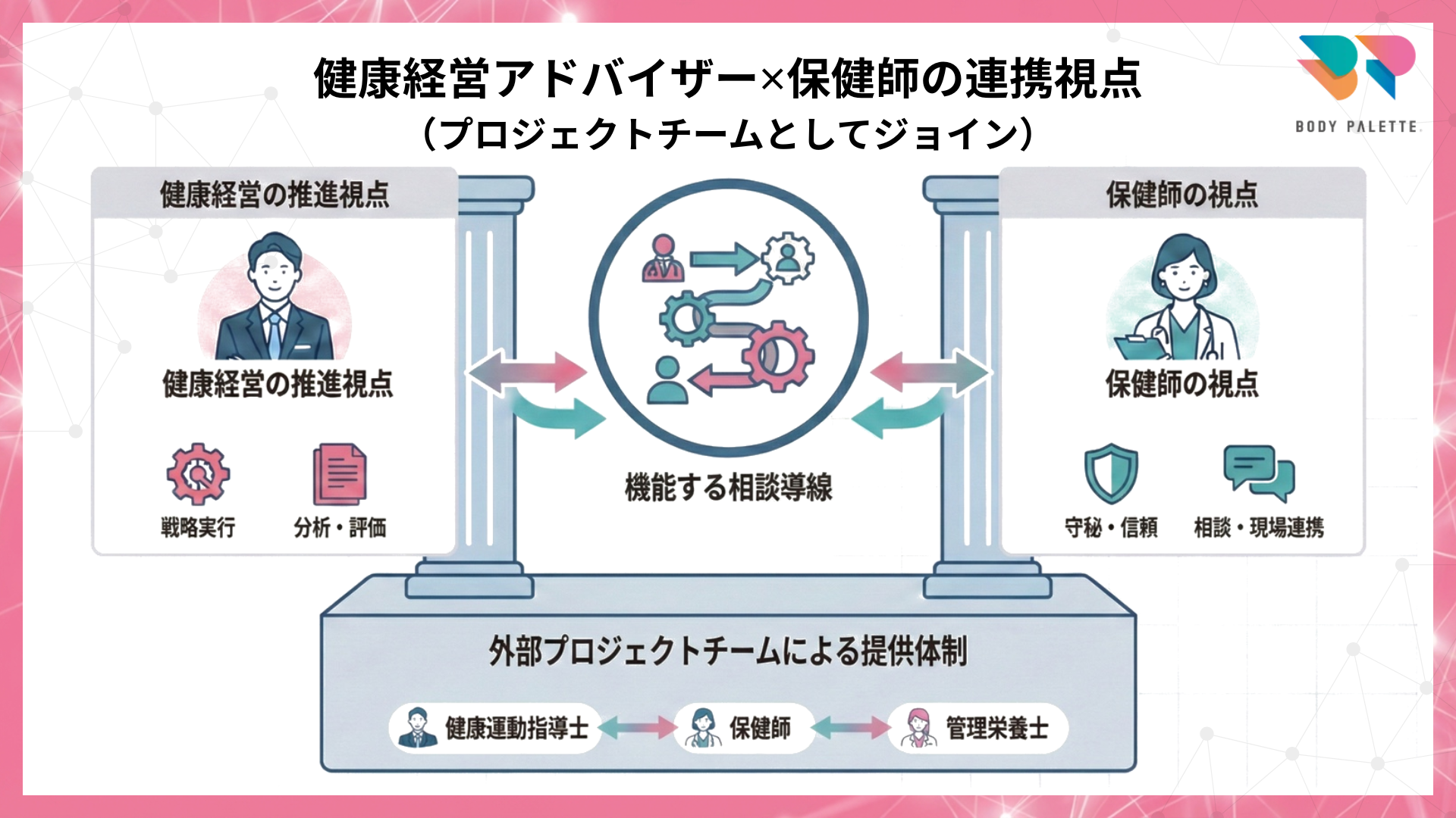 健康経営の推進視点(意思決定・実装の回し方)と、保健師の視点(守秘・相談対応・現場連携の現実解)を合わせ、企業ごとに設計することが重要になります。