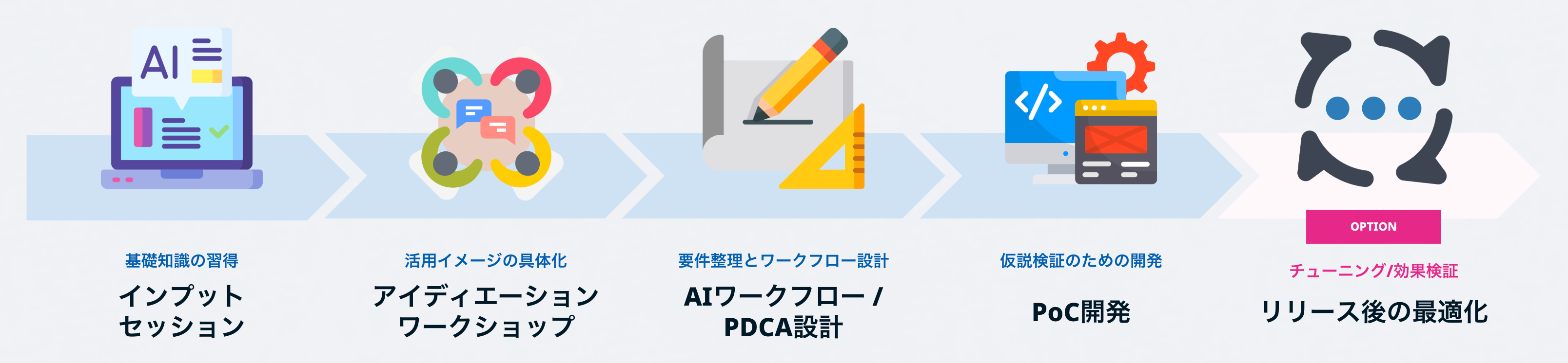 クリプトリエが提供する「AIオンボーディングコンサルティングサービス」は、企業が独自のAIシステムを構築し、組織全体でAIを活用するための包括的な支援サービスです。本サービスは、AI技術の基礎習得からアイデア創出、PoC開発まで一貫した支援を特徴としていますが、さらなる価値向上を目指し、業務プロセス改革の視点を強化することといたしました。