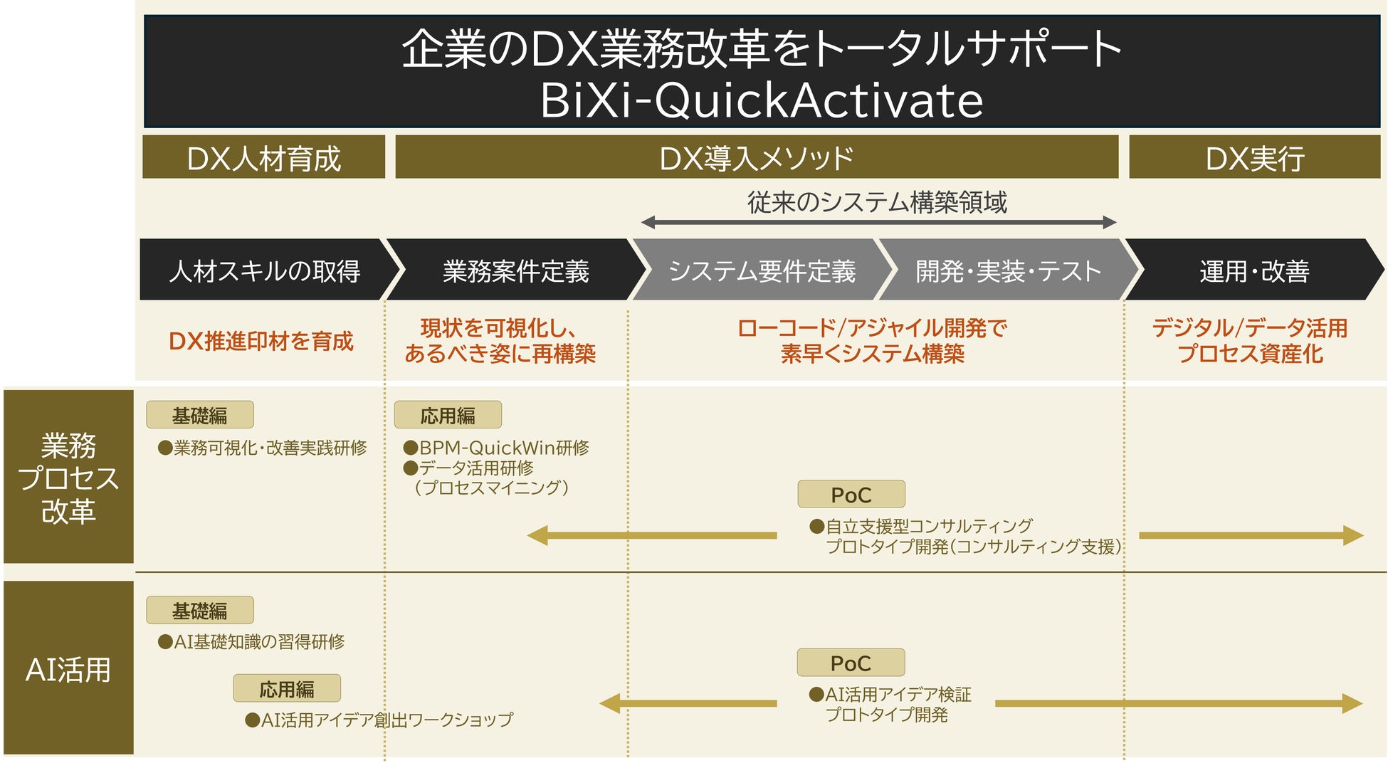 BiXiコンサルティングが提供するBiXi-QuickActivateは、お客様の業務プロセス改革をサポートする、トータルサービスをご提供しています。このサービスは、DX人材の育成研修、業務の見える化からあるべき姿に変えていく変革メソッドの提供、デジタルプロセス化を実現するローコード・アジャイル開発を含む製品ソリューションをセットで提供し、お客様自身が継続的かつクイックにDX業務改革を推進していけるよう支援していくトータルサポートサービスです。