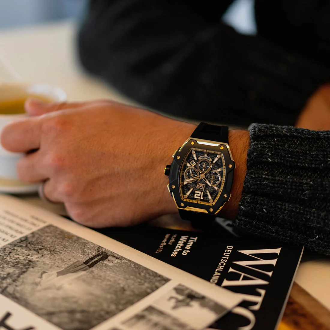 クロノグラフモデルはそれぞれ異なるダイヤルデザインが特徴で、カーボンファイバーダイヤルにオレンジのアクセントを効かせたアクティブな印象の「ブラックシルバー」、深みのあるブルーサンレイダイヤルが美しい「ブラックブルーシルバー」、ハニカムパターンとグレインテクスチャの組み合わせが視覚的にも楽しい「ブラックゴールド」の3種類。しなやかなシリコンラバーストラップは通気性を考慮したデザインで快適な装着感を実現。クロノグラフ機能(30分計、60分計)、24時間表示、日付表示を搭載し、10気圧防水性能を備えています。ムーブメントには日本製クォーツ「Miyota JS25」を採用しています。価格は44,000円(税込)。