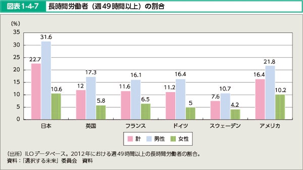 実際、厚生労働省による「厚生労働白書」からも、日本人が他国と比べて著しく長時間労働をしている様子がうかがい知れます。