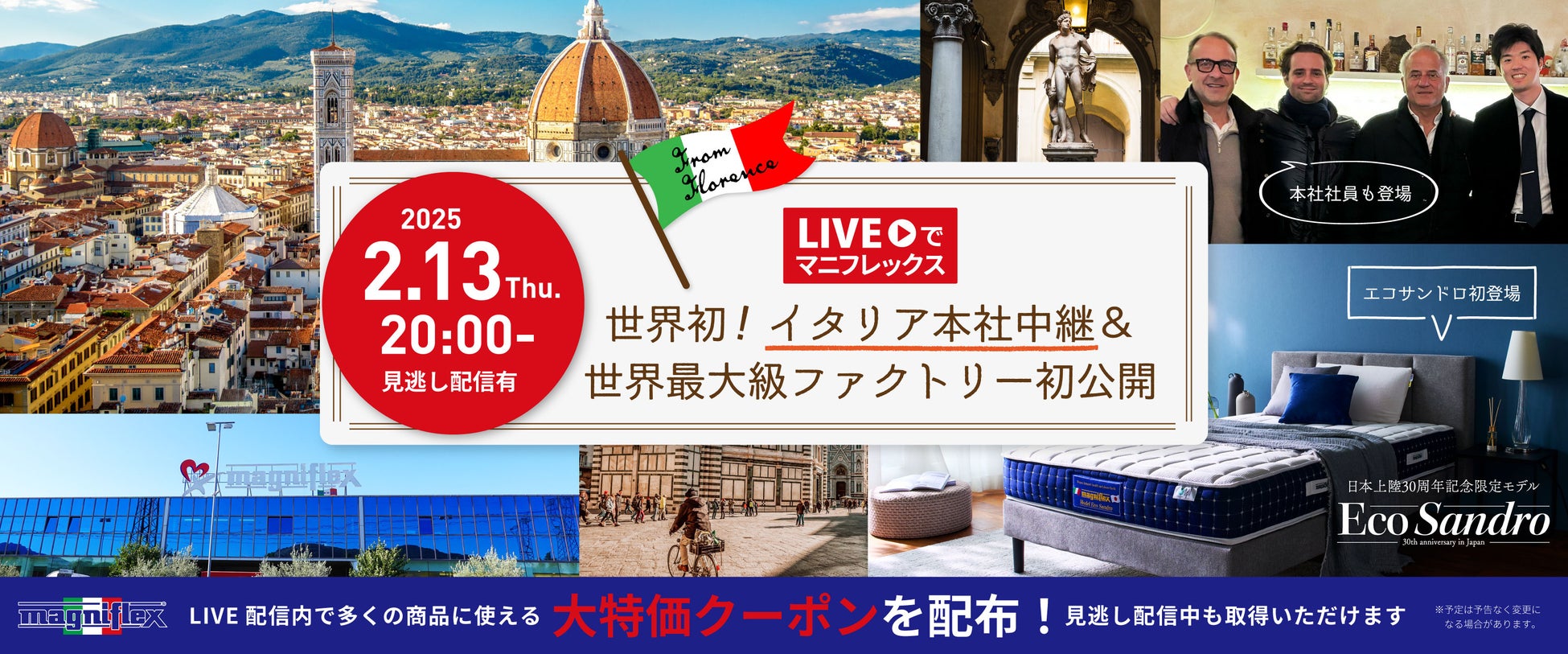 「世界初!マニフレックスイタリア本社中継&世界最大級ファクトリー初公開」スペシャルライブ配信決定