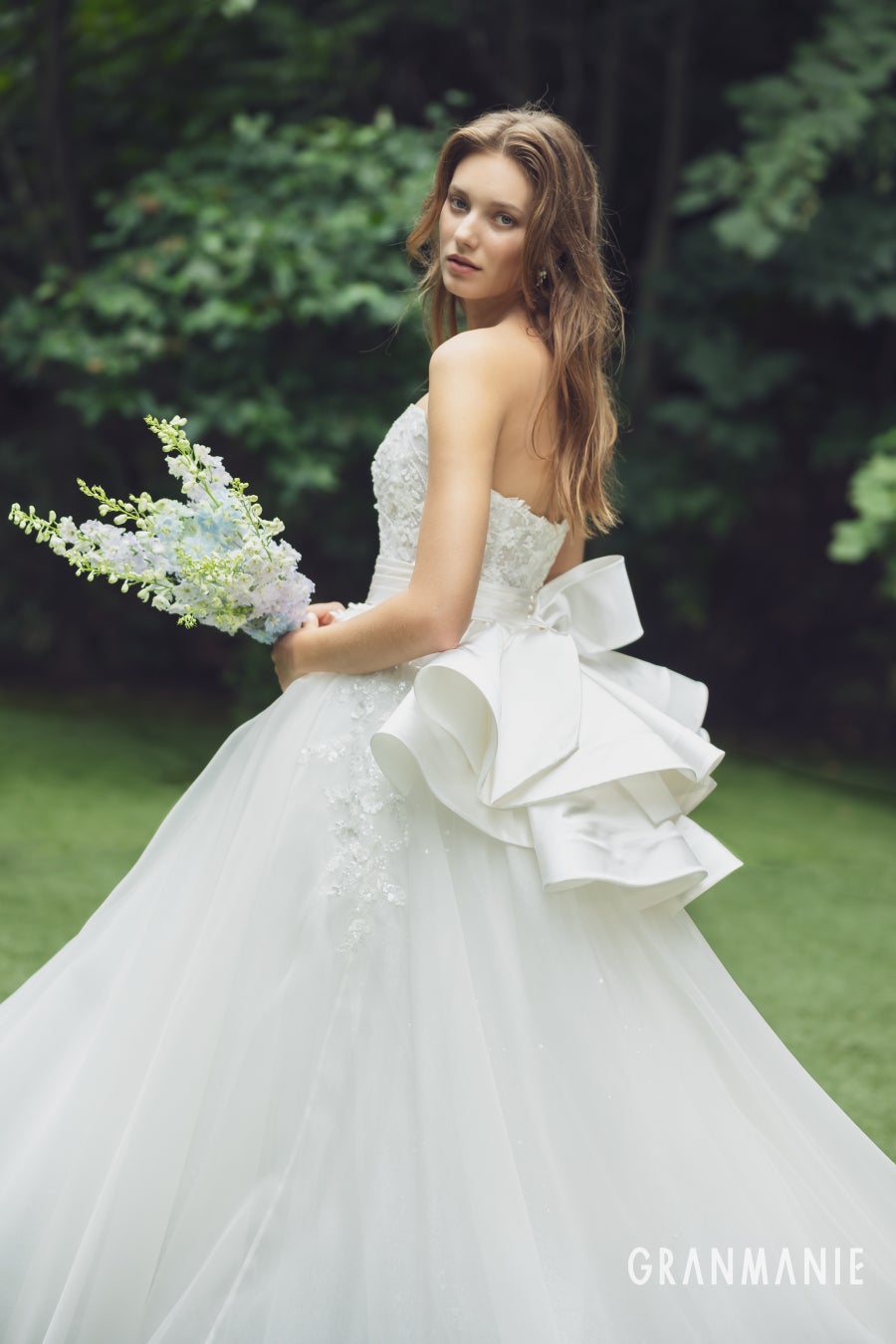 地中海に浮かぶ島々からインスピレーションを得たロザンナのドレス。海にさざ波がたつようなイメージのカッティングやフリル、リボン、ドレープを用い、女性らしさ、エレガントさを表現しています。また、ロザンナの魅力はイタリア最先端のトレンドをたっぷりと入れながらも、日本女性を釘付けにするウェディングドレス本来の華やかさとボリューム感にあります。