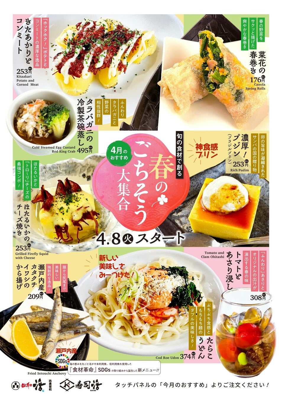 株式会社活美登利(本社:東京都品川区、代表取締役社長:土屋秀仁)が運営する「回し寿司活/寿司活」は、運営店舗全店で4月8日(火)より「季節のおすすめメニュー」を販売開始いたします。
