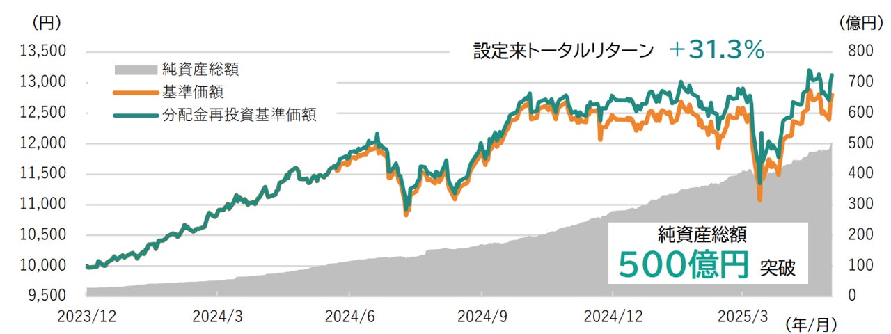 その結果、当ファンドは2025年5月29日時点で分配金お支払い後の基準価額12,802円、純資産総額505億円と好調なパフォーマンスを見せています。(分配金設定来合計300円お支払い)