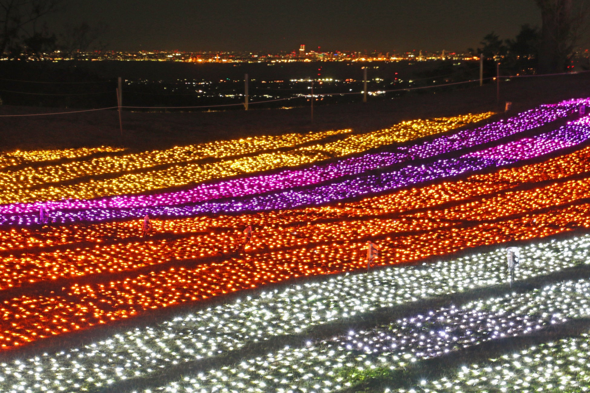 標高約300mの山頂に位置し東京湾を望む立地のマザー牧場だから見ることができる、景色とイルミのコラボレーションが特徴です。