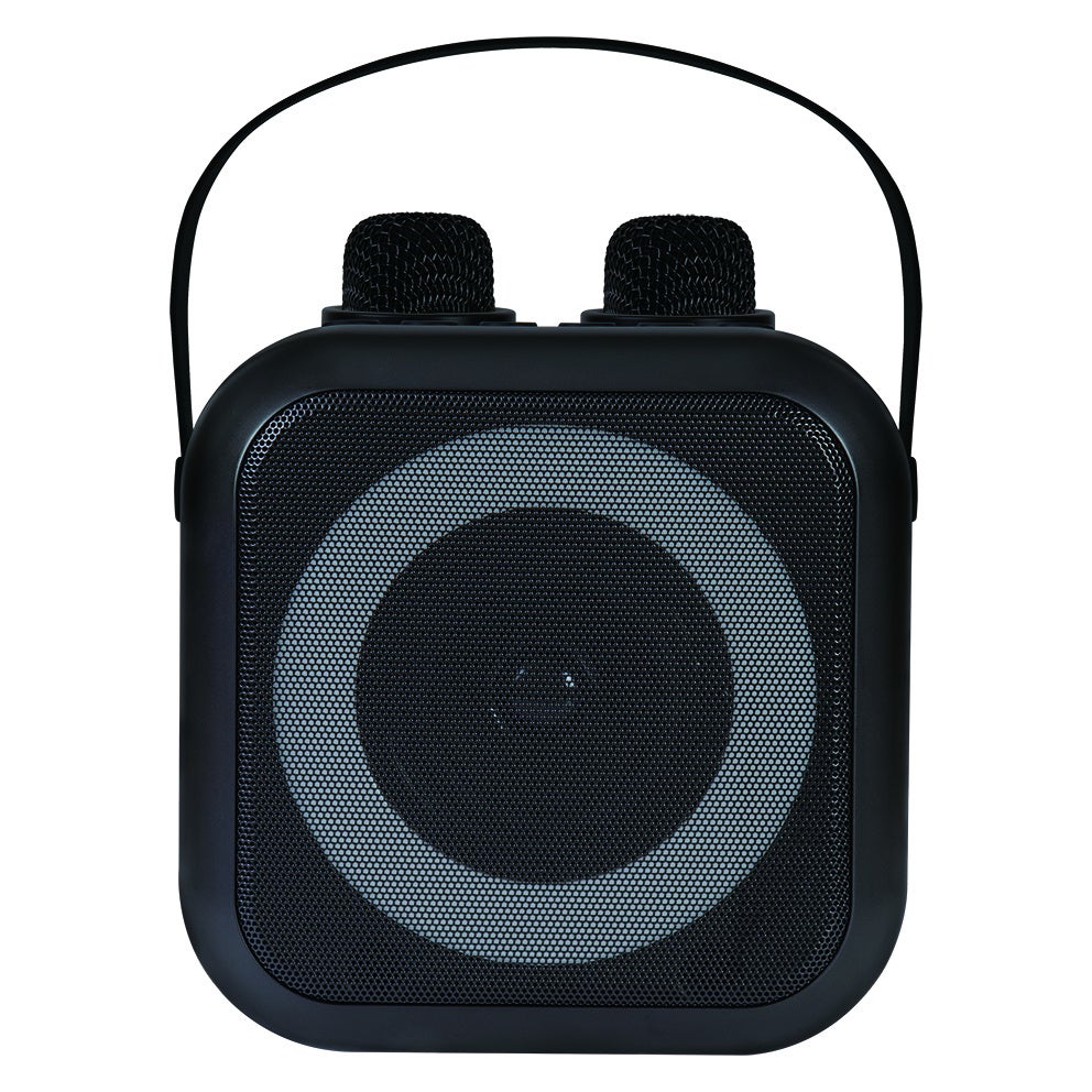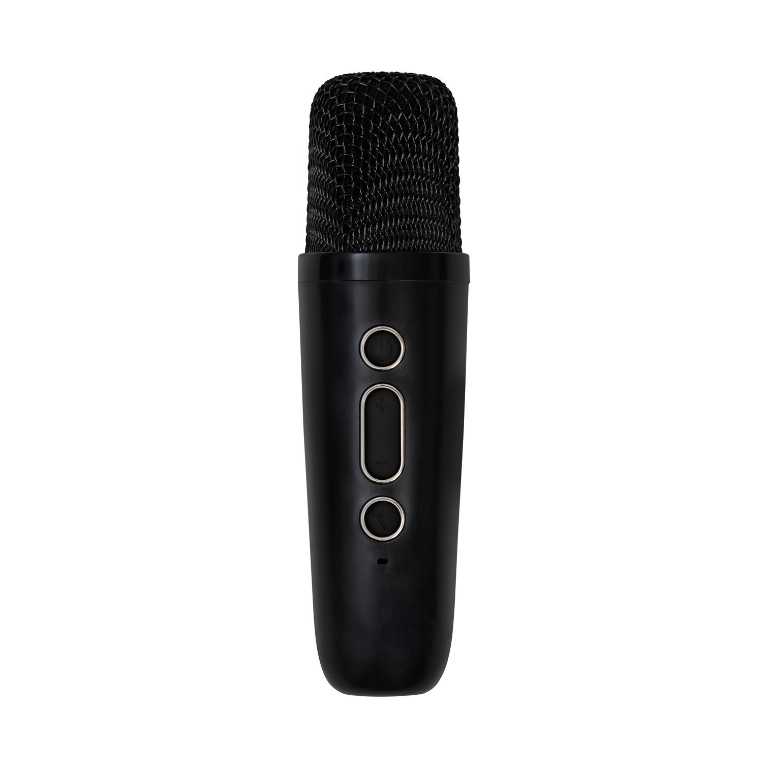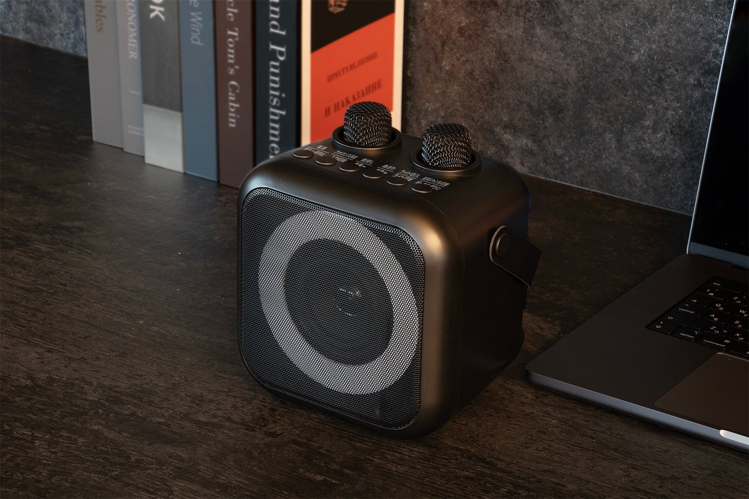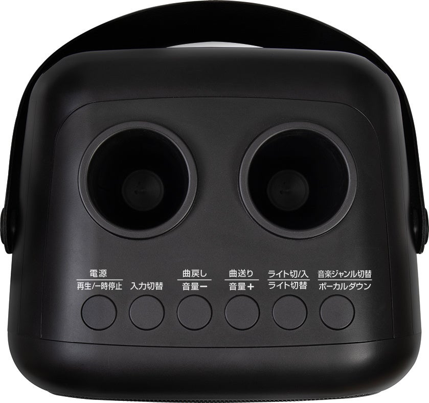 本製品は、楽曲のボーカル(歌声)を抑えてカラオケのように楽しめる「ボーカルダウン機能」により、普段お聴きの楽曲をカラオケとしてお楽しみいただけます。また、マイクに搭載された「ボイスチェンジ機能」により、⼦供・⼥性・男性・モンスター・ノーマルの5 種類の声⾊に切り替えが可能で、家族や友⼈との時間がより楽しくなります。