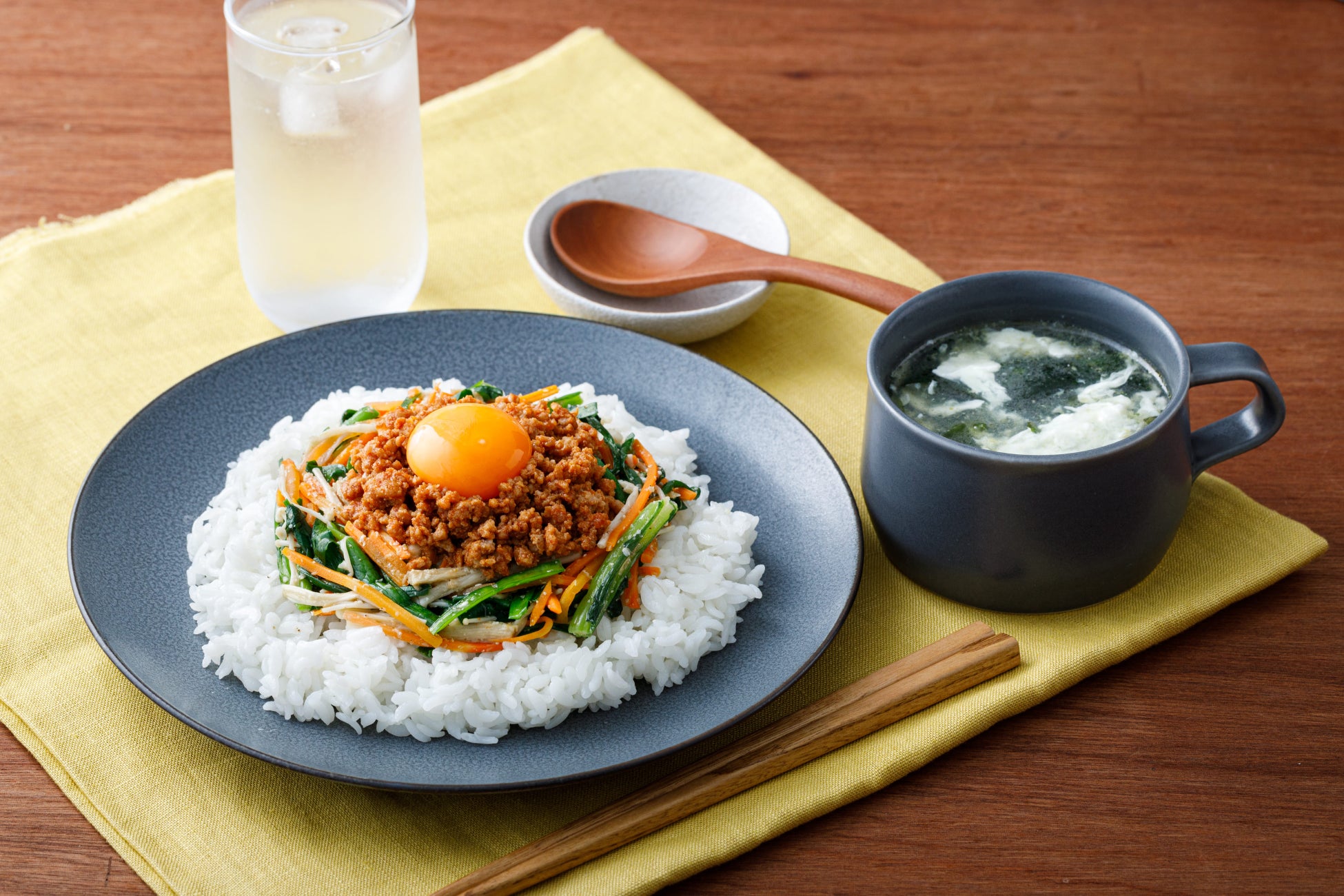 豚ひき肉のコチュジャン炒め、えのき、小松菜、人参、にらのナムルをたっぷりとのせたビビンバです。スプーンで混ぜながら味の変化をお楽しみください。卵白を使ってふわふわに仕上げたスープはそのままでも、酢とこしょうを加えて中華風にしても。お好みの味でお楽しみください。