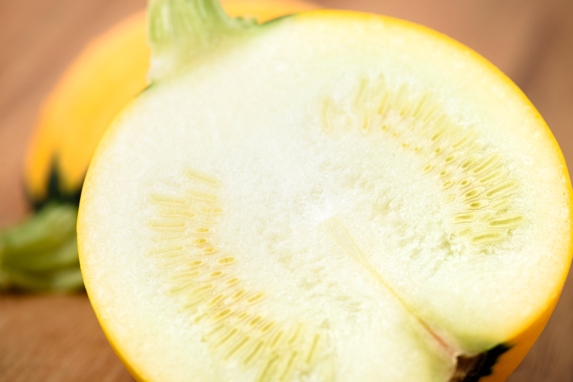 球形の丸いズッキーニ。直径は5~15cm程度で、果皮の色は緑色や黄色、薄緑色とさまざまです。未熟なうちに収穫するため、果肉はみずみずしくやわらかいです。