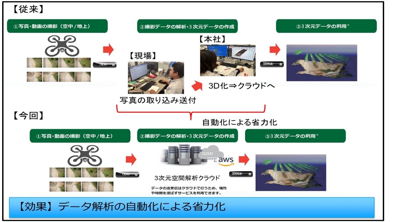 本現場では今まで、3D点群の作成は、ドローンから現場職員がSDカードを抜き取り、本社にデータを転送後、本社職員が手動にてSfm処理を実施し、専用ビューワソフトにアップロードすることで現場との共有を図っていました。