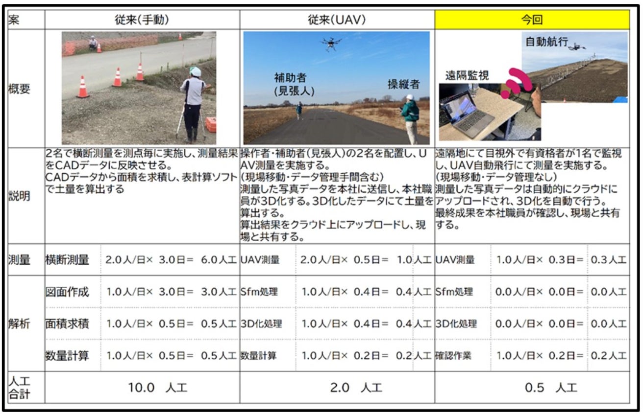 測量からデータ作成・土量算出までに必要となる人工を比較しました。従来の測量機械を使用した人力による計測では、本現場の測点数から測量に6.0人工、図面作成に3.0人工、土量計算に1.0人工の計10人工を要します。それに対し、従来のUAV測量では、現場にパイロットと補助者2名が約半日の1.0人工、データ処理・3D化・土量の計算が全て手作業となるため1.0人工(ソフトによる解析時間は除く)の計2.0人工が発生します。