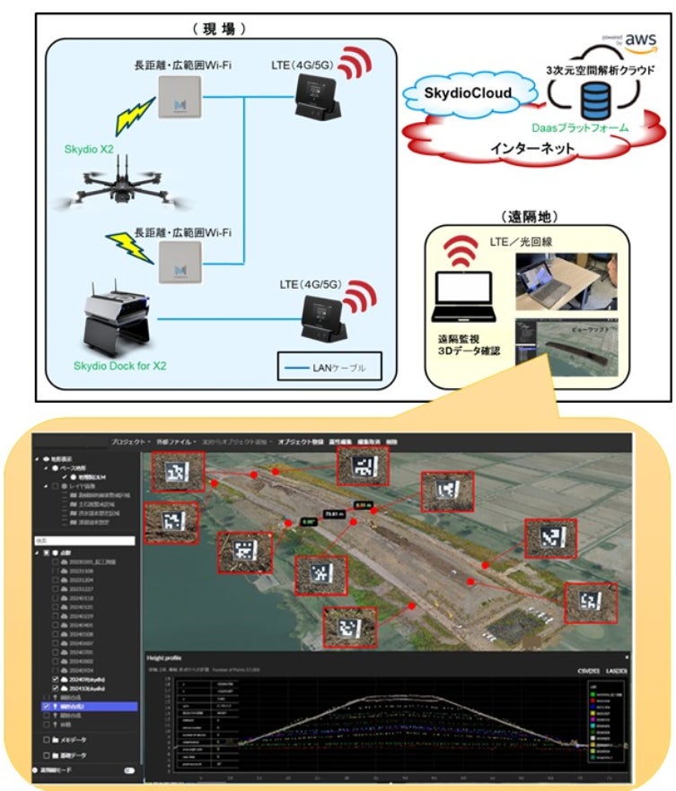 通信建設大手の株式会社ミライト・ワン(本社:東京都江東区、代表取締役社長:中山俊樹、以下ミライト・ワン)は、グループ会社の西武建設株式会社(本社:埼玉県所沢市、代表取締役社長:佐藤 誠、以下西武建設)とともに、西武建設が施工中の荒川第二調節池下大久保上流工区囲繞堤工事(国土交通省 関東地方整備局 荒川調節池工事事務所)において、 BIM/CIM(※1)活用工事として、遠隔監視ドローンSkydio Dock for X2と3D点群データの自動作成により、土量管理における省人化・スピード化を実現しました。なお、遠隔監視ドローンの活用は、実証実験や点検での実績はありますが、BIM/CIMデータを活用する実現場での適用は国内初(※2)の取り組みとなります。