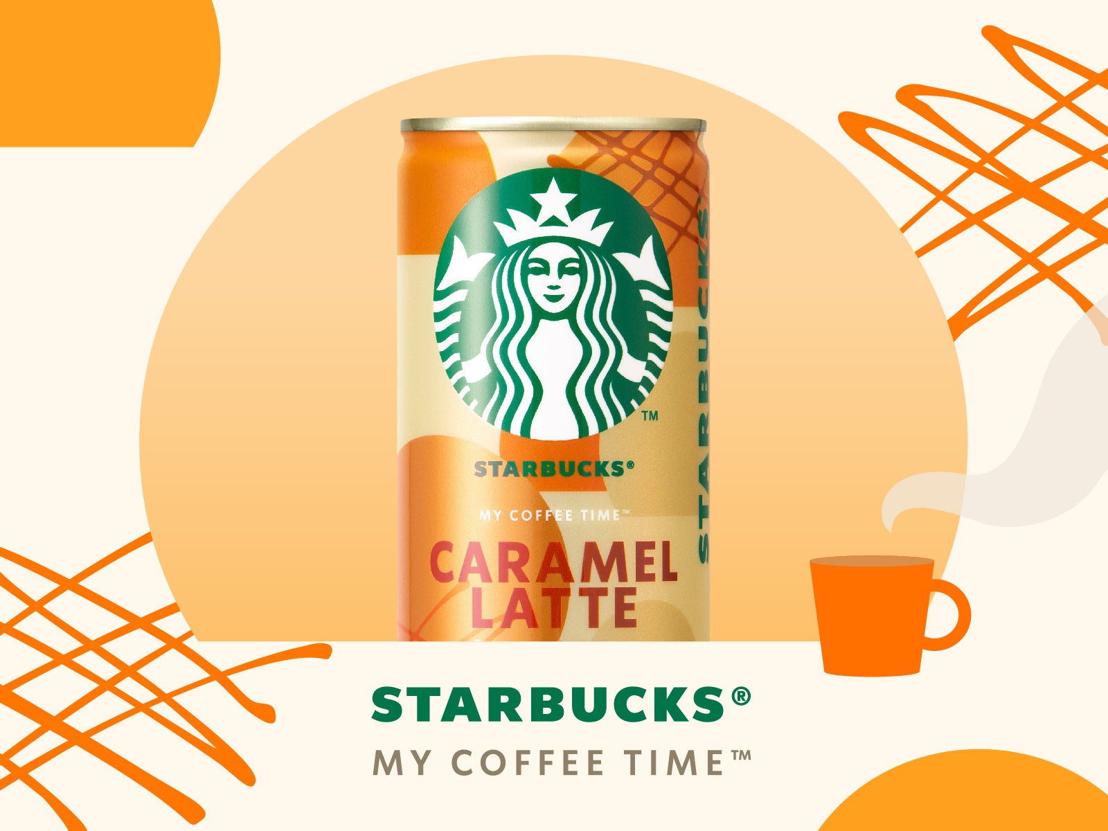 窓をモチーフにくつろぎの時間をイメージした円形のアイコンと、オレンジを基調とした暖色の背景で、キャラメルラテのやさしい甘さとまろやかさを表現しました。ブランドを象徴するサイレンロゴを中央に配置し、さらにキャラメルソースをイメージした模様をあしらうことで、とろけるような甘い味わいを感じるデザインに仕上げました。