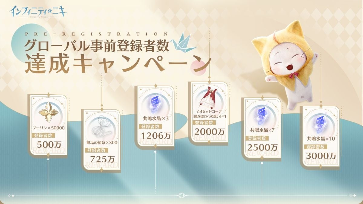 『インフィニティニキ』グローバル事前登録者数2000万人突破、事前登録キャンペーン開催中!条件達成で「共鳴水晶*20」や「☆4セットコーデ」などの豪華報酬をプレゼントする。