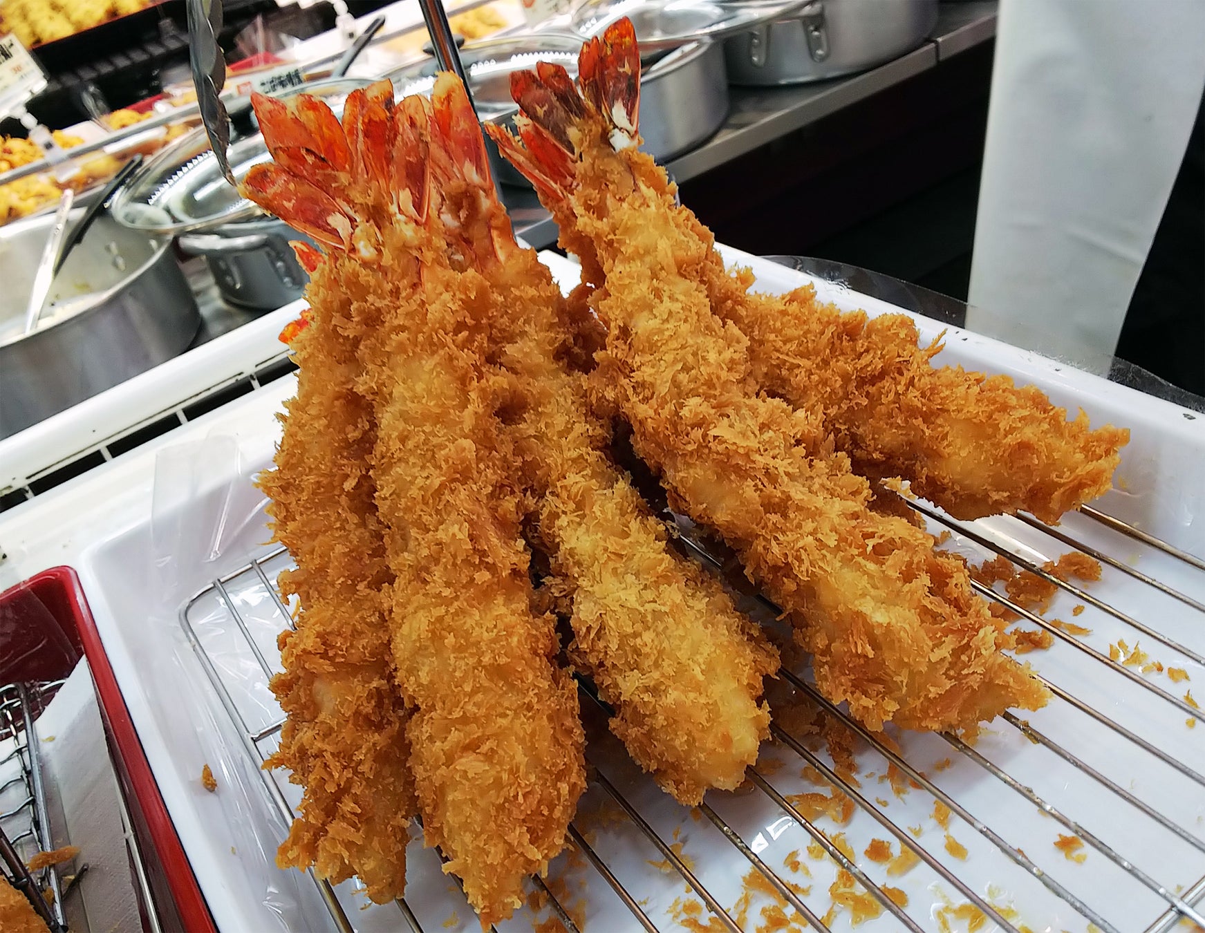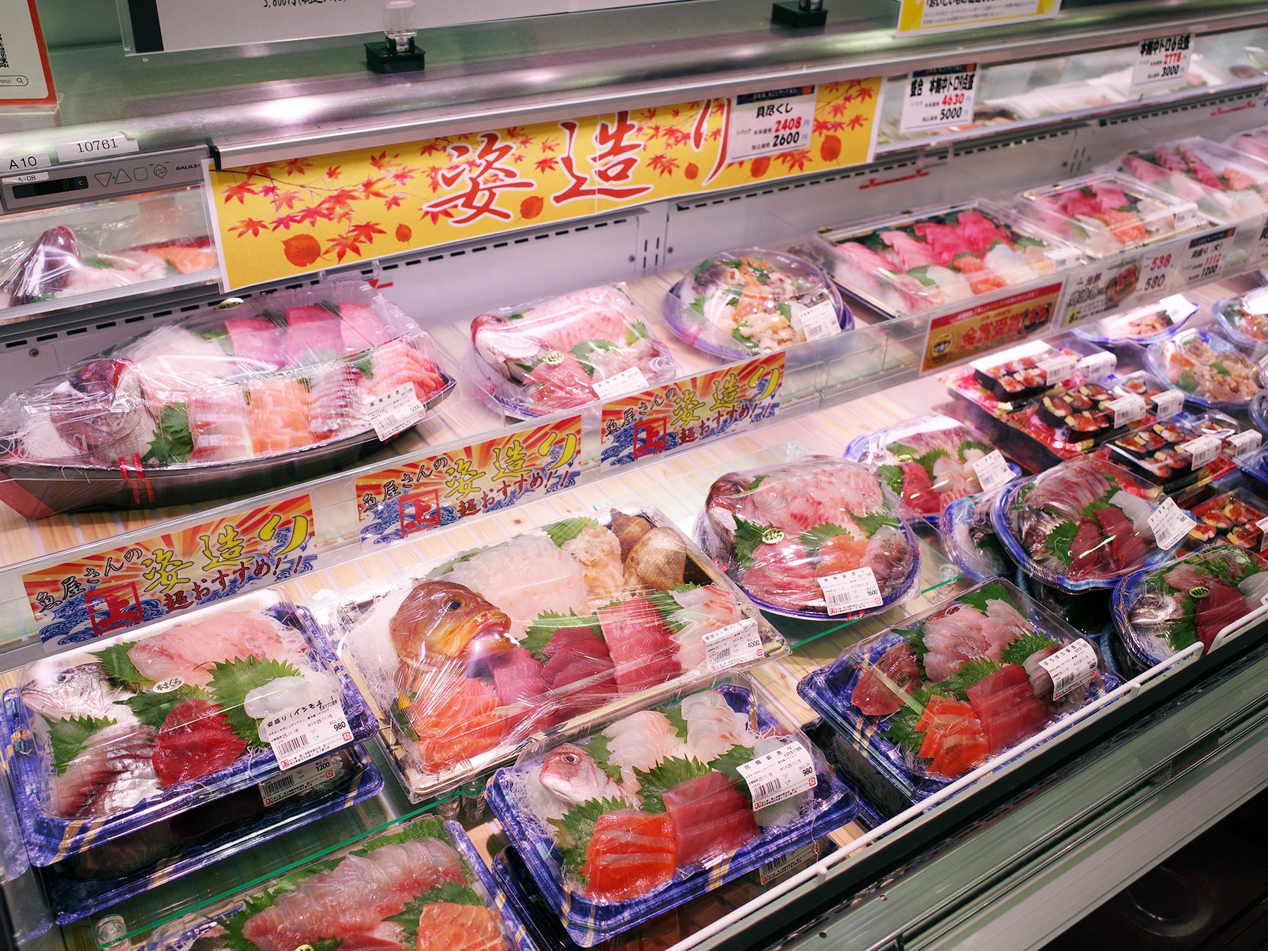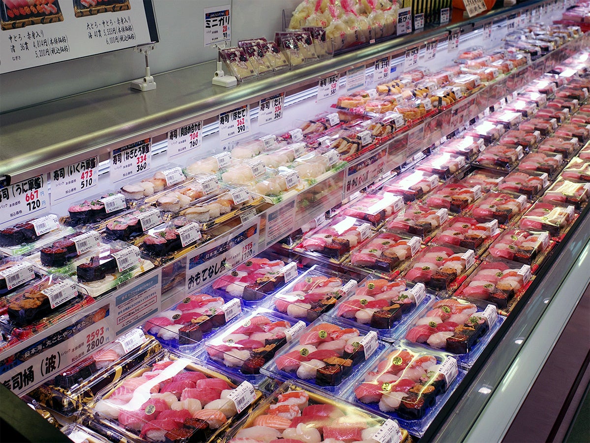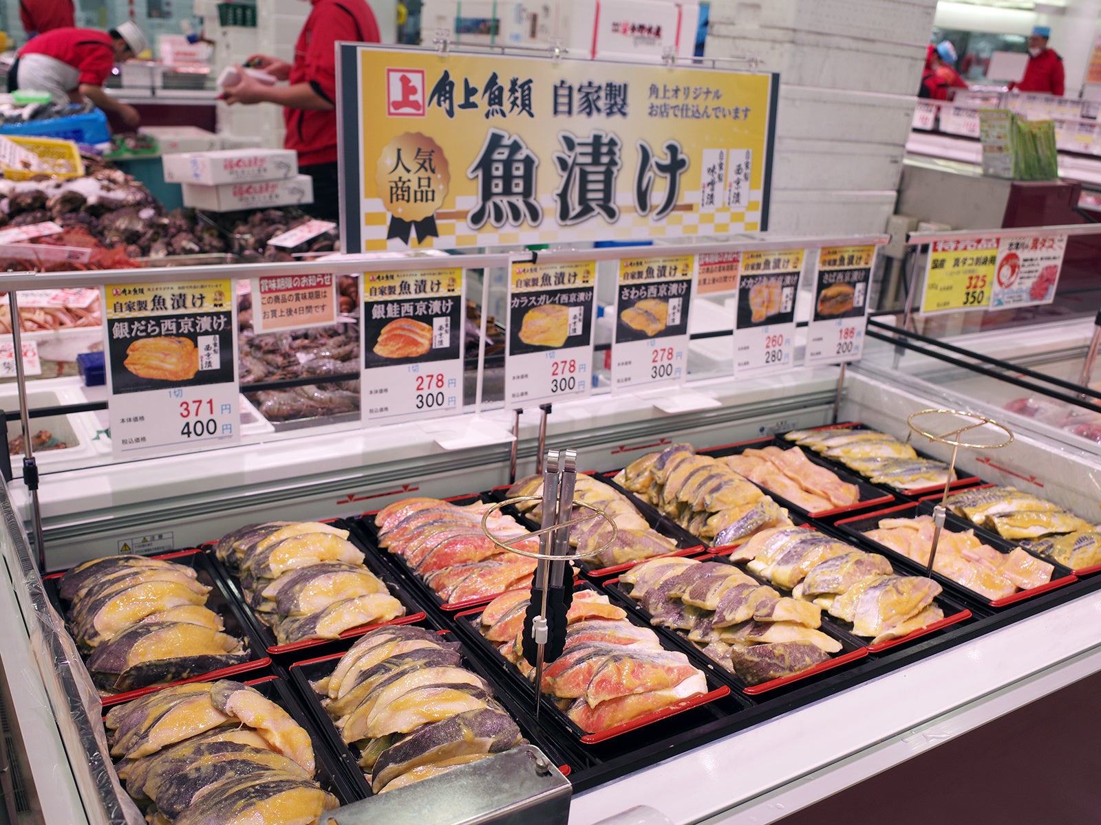 一日中ずっと、バックヤードのあちこちで鮮魚が身おろしされ、刺身や寿司、フライに天ぷら、様々な商品が作られています。