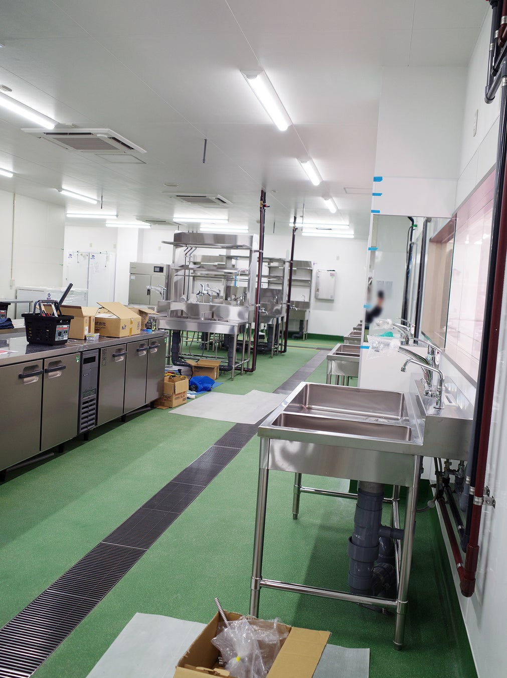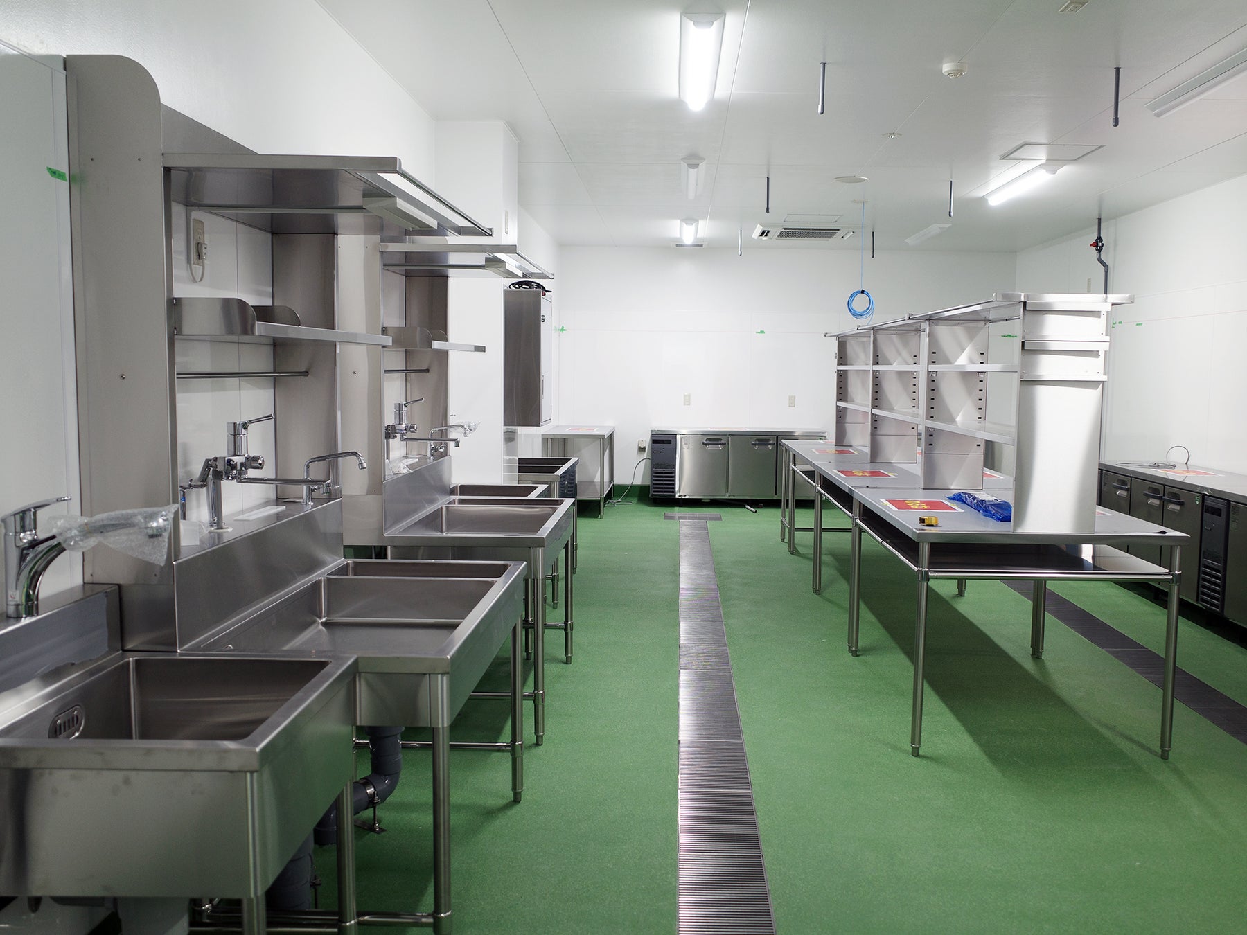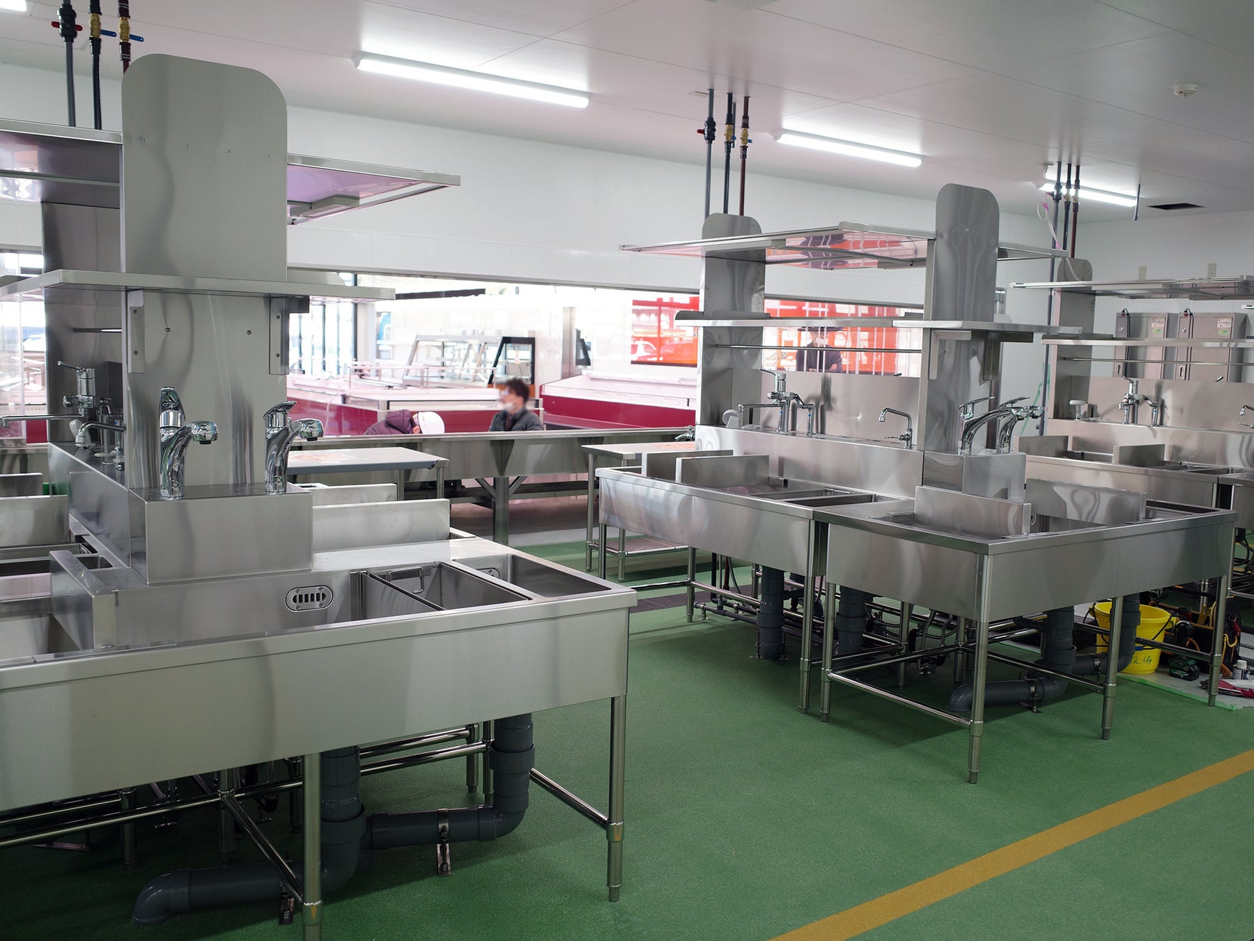 鮮魚を丸ごと販売し、お客様のご要望にそって身おろし調理する対面売場では、多くのご注文が同時に入ったとしてもスピーディに要望にお応えできるように、そして刺身の製造では丸ごとの魚から盛合せを作ることができるように、とそれぞれの部門によっていくつものシンク台が必要になるのが、私たち角上魚類の基本的な営業スタイルであるからです。