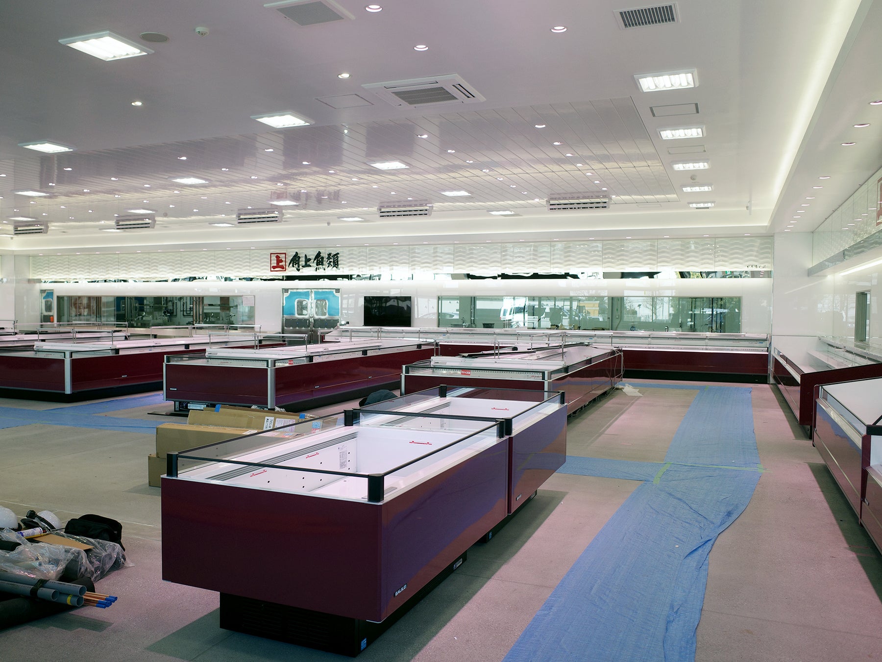 売り場面積とほぼ同等の広さの製造、冷蔵冷凍スペースが設けられており、さらに従業員用スペース(休憩室、更衣室など)を含めれば、バックヤードの方が売場面積よりはるかに広く、売場面積の1.2倍近くなります。一般的なスーパーなどでは売り場面積のおよそ30%程度の広さが目安とされていますので、この逆転現象ともいえる広さは角上魚類だけではないでしょうか。