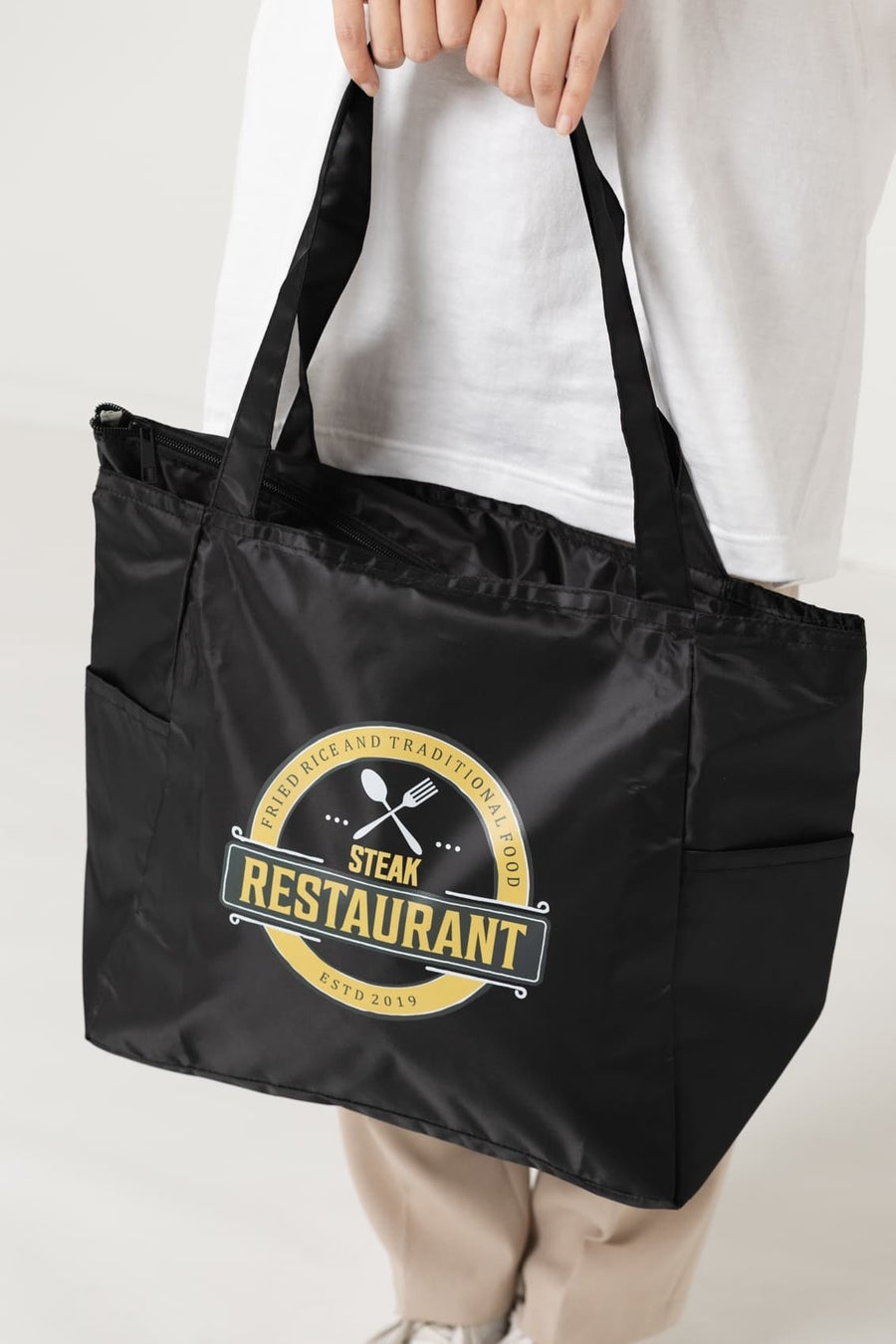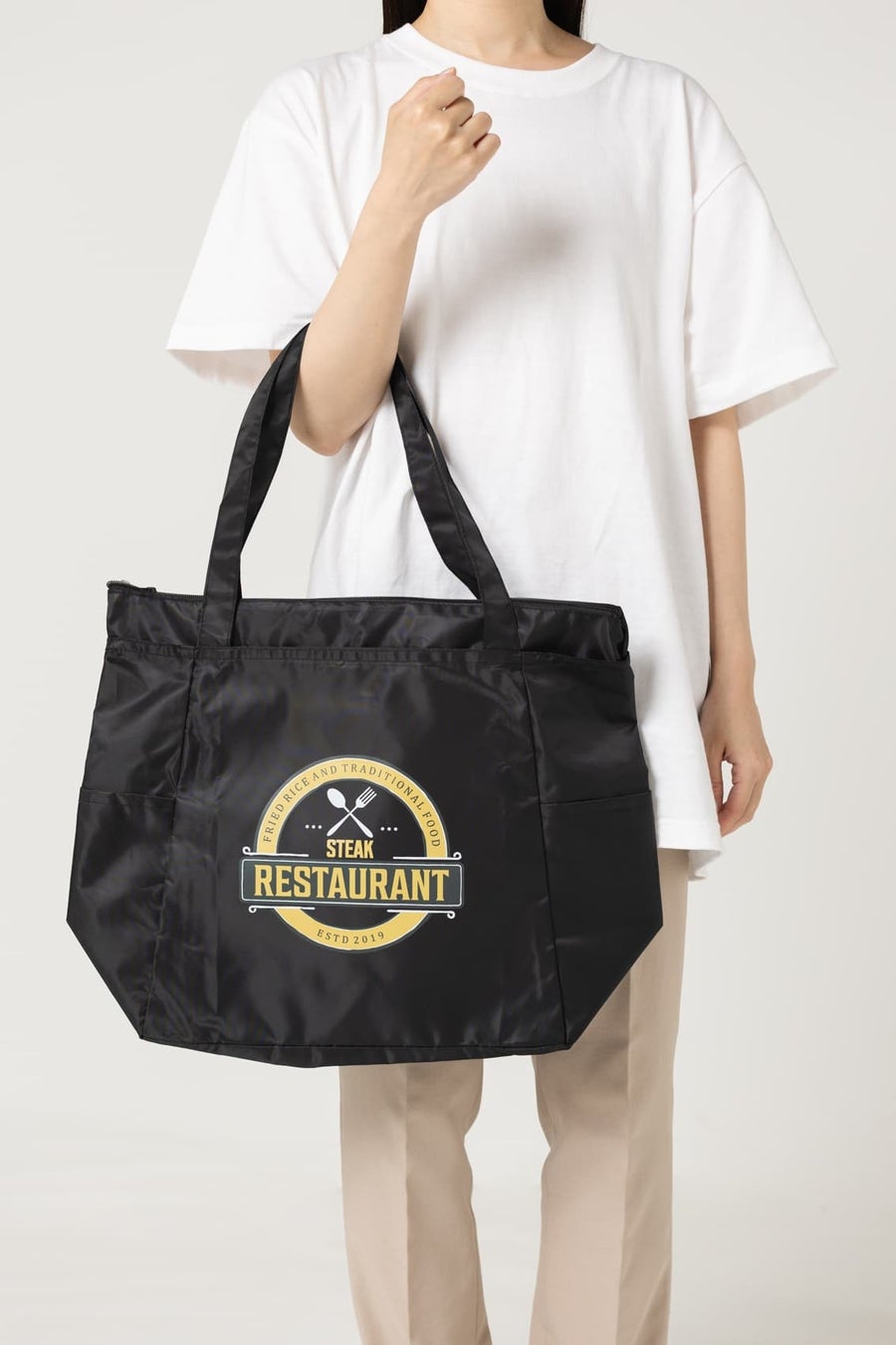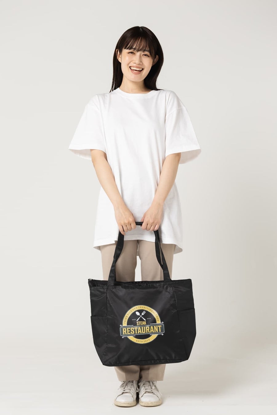 薄手でしなやかな素材を使用し、折りたたんでコンパクトに持ち運びが可能な保冷 トートバッグです。かさばらず、ごわつかない設計で、カバンの中にもすっきり収納 できます。両サイドにはスマートフォンや折りたたみ傘などを収納できる便利なポ ケットを装備。バッグの口元はファスナー付きで、開け閉めしやすく、容量いっぱい に食材や日用品を詰め込めます。日々のお買い物はもちろん、週末のまとめ買いにも 最適な大容量タイプ。食品関係のノベルティや販促キャンペーン用のアイテムとして も最適な商品です。