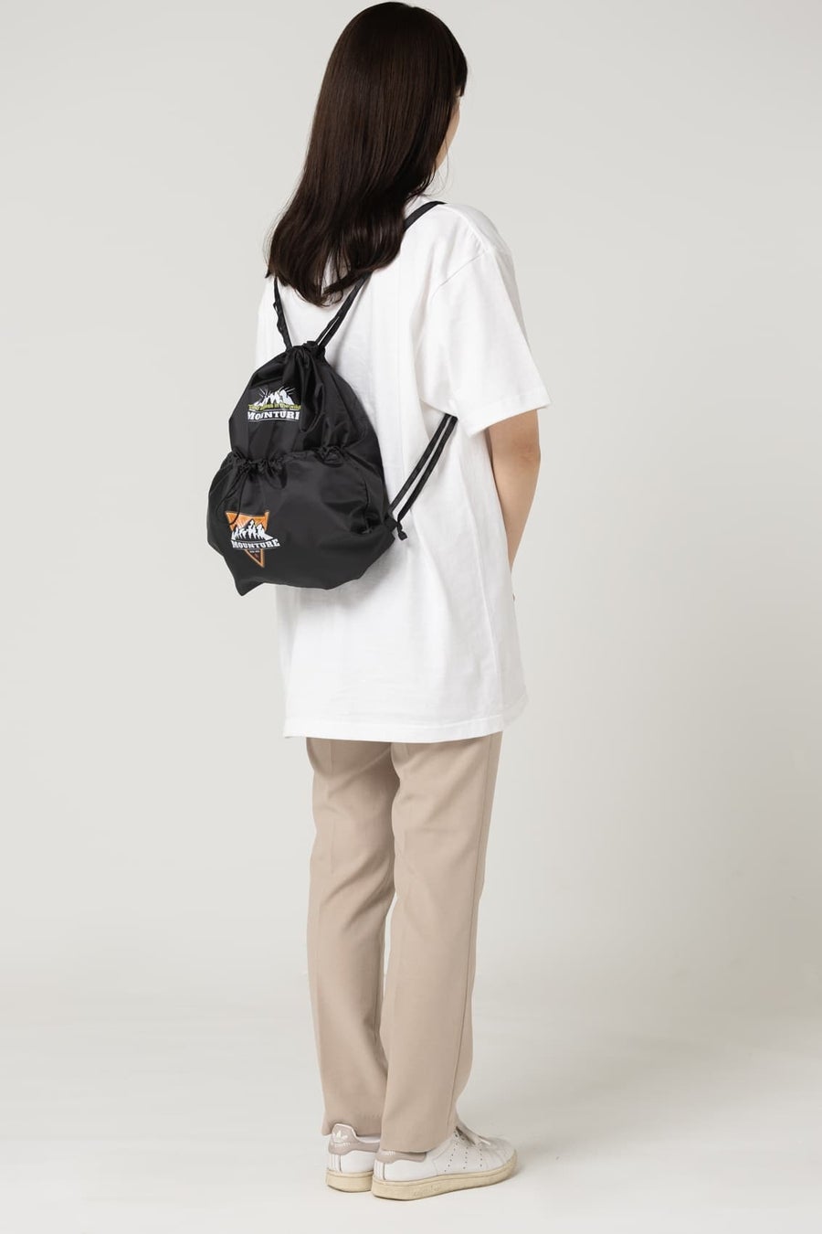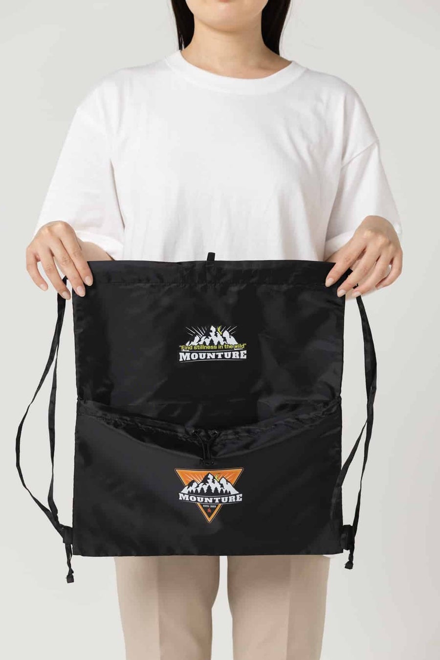 日常使いからアウトドア・スポーツ・防災用まで幅広く活躍するナップサックです。前面ポ ケットには、アウトドアテイストのギャザーとストッパーを採用したデザインを施し、シン プルながらもおしゃれなアクセントに仕上げました。 ペットボトルやタオルもしっかり入る実用的なサイズ感。また、非常用バッグや店舗の開店 記念ノベルティなどにも活用できます。