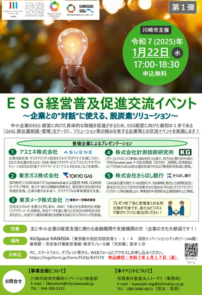 「金融にも強い総合サービス業」を将来像に掲げるきらぼしグループの株式会社きらぼしコンサルティング(本社:東京都港区、代表取締役社長 中野良明)が運営するインキュベーション施設「KicSpaceHANEDA」にて、ESG 要素を考慮した金融の拡大による脱炭素経営等の促進を目的としたイベント「ESG経営普及促進交流イベント」(主催者:川崎市 以下、「本イベント」といいます。)が開催されますのでお知らせいたします。