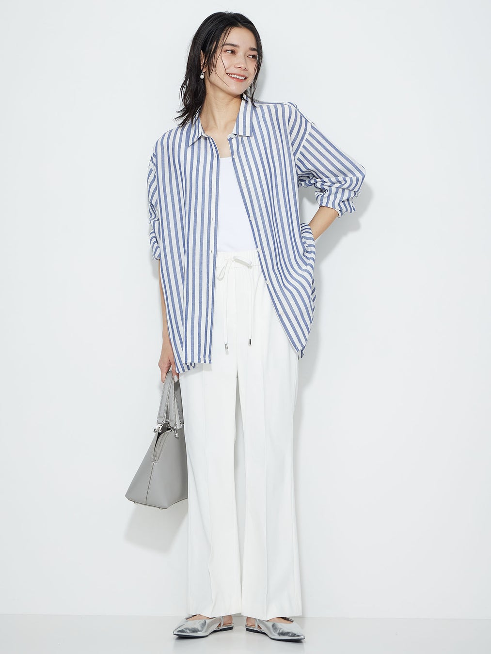 この度「PLUS STYLEパンツ(リネンブレンド)」に、フレアシルエットが新たに仲間入りします。膝より少し高い位置から裾に向けて緩やかに広がるフレアシルエットが膝下を長く見せ、美脚見えが期待できる1本です。ウエストは総ゴム仕様かつ「ドローストリング」と呼ばれるウエストに紐を通したデザインのため、体に合わせて調整ができ、快適なはき心地を実現します。