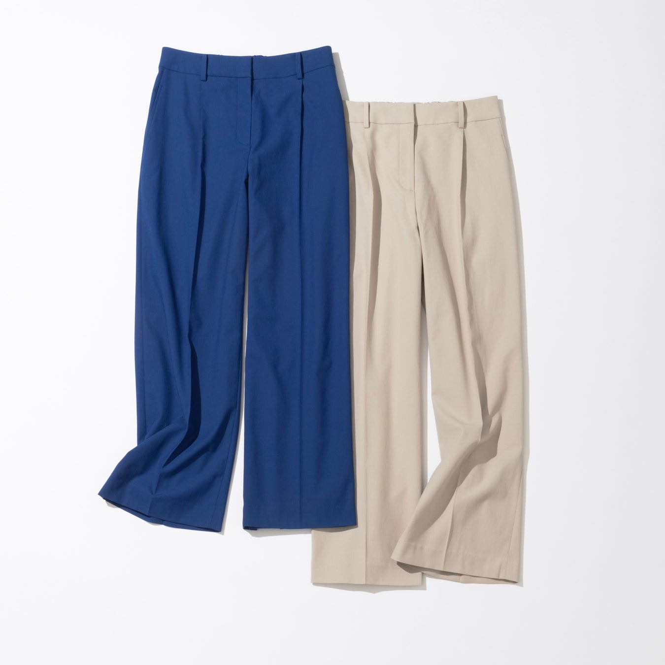今年の「PLUS STYLEワイドパンツ」は、昨年度から股下を4cm長くアップデート。くるぶしが隠れる丈になり、脚長効果がさらにアップしました。また、今年はノータックのデザインからタック入りに変更し、腰回りにゆとりを持たせました。
