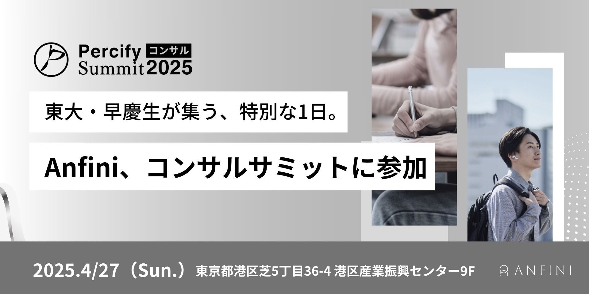 株式会社Anfini(本社:東京都港区、代表取締役:橋本 純)は、2025年4月27日(日)に開催されるハイクラス学生特化キャリアイベント「Percifyコンサルサミット2025」へ協賛いたします。