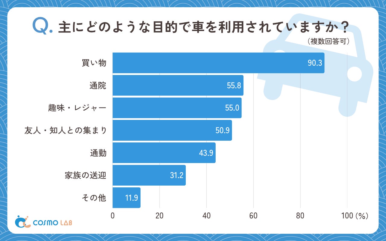 「買い物」(90.3%)が最も多く、次いで「通院」(55.8%)、「趣味・レジャー」(55.0%)、「友人・知人との集まり」(50.9%)、「通勤」(43.9%)が続きます。生活を維持するための手段として車を利用している回答者が多く、公共交通機関では補えない日常的な移動ニーズが強く存在することが示唆されます。