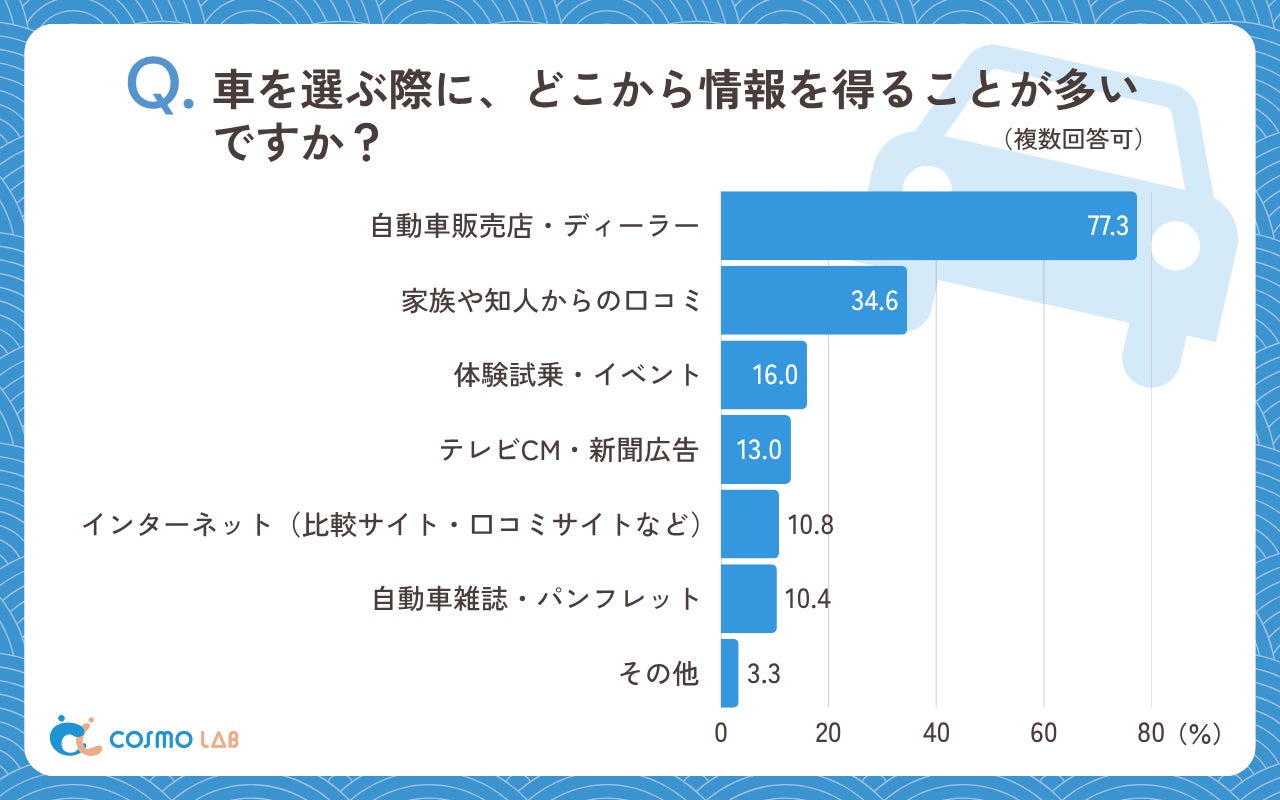 情報収集では「自動車販売店・ディーラー」(77.3%)が主要チャネルとなっており、対面での相談を重視する姿勢が表れています。インターネット利用は1割程度にとどまり、人的接点の重要性が確認されました。