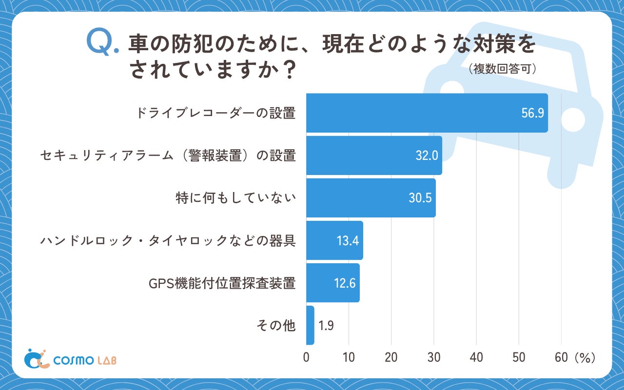 「ドライブレコーダーの設置」(56.9%)が最も多く、「セキュリティアラーム(警報装置)の設置」(32.0%)、「特に何もしていない」(30.5%)が続きます。防犯意識は一定程度ありますが、物理的防犯対策の普及促進には支援策が求められます。